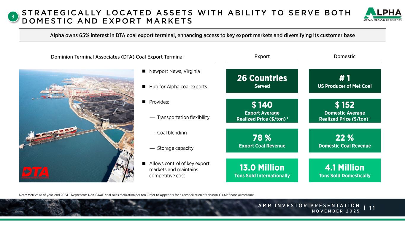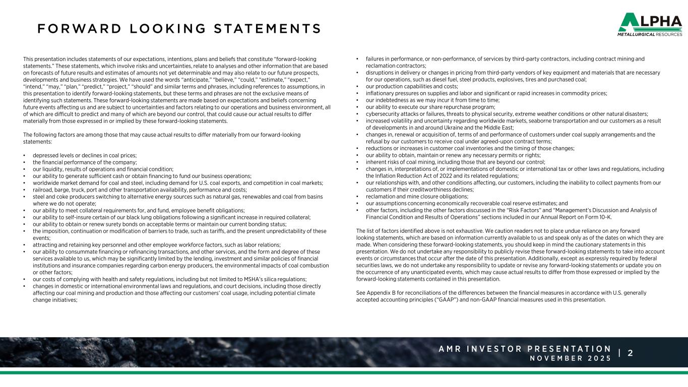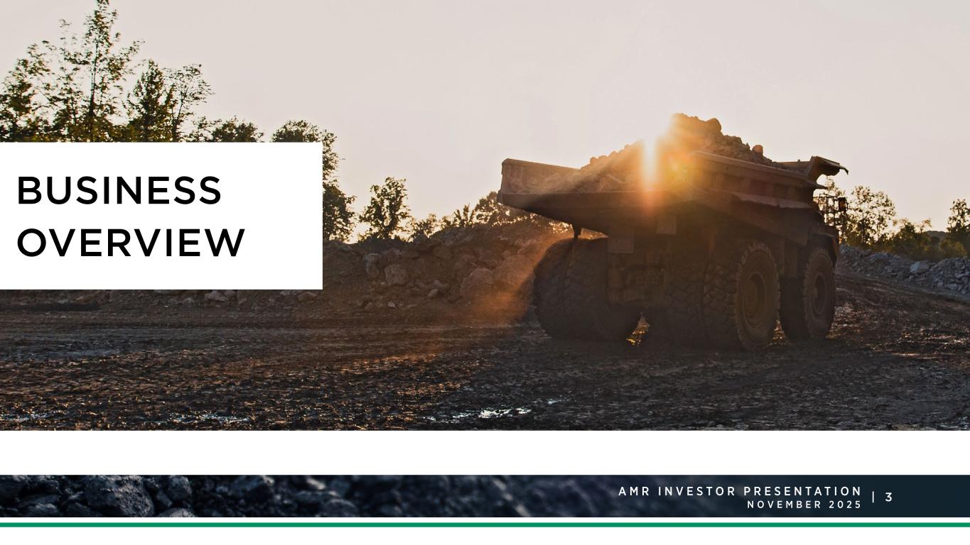 2A M R R a t i n g s A g e n c y P r e s e n t a t i o n J a n u a r y 2 0 2 5 |A M R I N V E S T O R P R E S E N T A T I O N N O V E M B E R F O R WA R D LO O K I N G S TAT E M E N T S This presentation includes statements of our expectations, intentions, plans and beliefs that constitute “forward-looking statements.” These statements, which involve risks and uncertainties, relate to analyses and other information that are based on forecasts of future results and estimates of amounts not yet determinable and may also relate to our future prospects, developments and business strategies. We have used the words “anticipate,” “believe,” “could,” “estimate,” “expect,” “intend,” “may,” “plan,” “predict,” “project,” “should” and similar terms and phrases, including references to assumptions, in this presentation to identify forward-looking statements, but these terms and phrases are not the exclusive means of identifying such statements. These forward-looking statements are made based on expectations and beliefs concerning future events affecting us and are subject to uncertainties and factors relating to our operations and business environment, all of which are difficult to predict and many of which are beyond our control, that could cause our actual results to differ materially from those expressed in or implied by these forward-looking statements. The following factors are among those that may cause actual results to differ materially from our forward-looking statements: • depressed levels or declines in coal prices; • the financial performance of the company; • our liquidity, results of operations and financial condition; • our ability to generate sufficient cash or obtain financing to fund our business operations; • worldwide market demand for coal and steel, including demand for U.S. coal exports, and competition in coal markets; • railroad, barge, truck, port and other transportation availability, performance and costs; • steel and coke producers switching to alternative energy sources such as natural gas, renewables and coal from basins where we do not operate; • our ability to meet collateral requirements for, and fund, employee benefit obligations; • our ability to self-insure certain of our black lung obligations following a significant increase in required collateral; • our ability to obtain or renew surety bonds on acceptable terms or maintain our current bonding status; • the imposition, continuation or modification of barriers to trade, such as tariffs, and the present unpredictability of these events; • attracting and retaining key personnel and other employee workforce factors, such as labor relations; • our ability to consummate financing or refinancing transactions, and other services, and the form and degree of these services available to us, which may be significantly limited by the lending, investment and similar policies of financial institutions and insurance companies regarding carbon energy producers, the environmental impacts of coal combustion or other factors; • our costs of complying with health and safety regulations, including but not limited to MSHA’s silica regulations; • changes in domestic or international environmental laws and regulations, and court decisions, including those directly affecting our coal mining and production and those affecting our customers’ coal usage, including potential climate change initiatives; • failures in performance, or non-performance, of services by third-party contractors, including contract mining and reclamation contractors; • disruptions in delivery or changes in pricing from third-party vendors of key equipment and materials that are necessary for our operations, such as diesel fuel, steel products, explosives, tires and purchased coal; • our production capabilities and costs; • inflationary pressures on supplies and labor and significant or rapid increases in commodity prices; • our indebtedness as we may incur it from time to time; • our ability to execute our share repurchase program; • cybersecurity attacks or failures, threats to physical security, extreme weather conditions or other natural disasters; • increased volatility and uncertainty regarding worldwide markets, seaborne transportation and our customers as a result of developments in and around Ukraine and the Middle East; • changes in, renewal or acquisition of, terms of and performance of customers under coal supply arrangements and the refusal by our customers to receive coal under agreed-upon contract terms; • reductions or increases in customer coal inventories and the timing of those changes; • our ability to obtain, maintain or renew any necessary permits or rights; • inherent risks of coal mining, including those that are beyond our control; • changes in, interpretations of, or implementations of domestic or international tax or other laws and regulations, including the Inflation Reduction Act of 2022 and its related regulations; • our relationships with, and other conditions affecting, our customers, including the inability to collect payments from our customers if their creditworthiness declines; • reclamation and mine closure obligations; • our assumptions concerning economically recoverable coal reserve estimates; and • other factors, including the other factors discussed in the “Risk Factors” and “Management’s Discussion and Analysis of Financial Condition and Results of Operations” sections included in our Annual Report on Form 10-K. The list of factors identified above is not exhaustive. We caution readers not to place undue reliance on any forward looking statements, which are based on information currently available to us and speak only as of the dates on which they are made. When considering these forward-looking statements, you should keep in mind the cautionary statements in this presentation. We do not undertake any