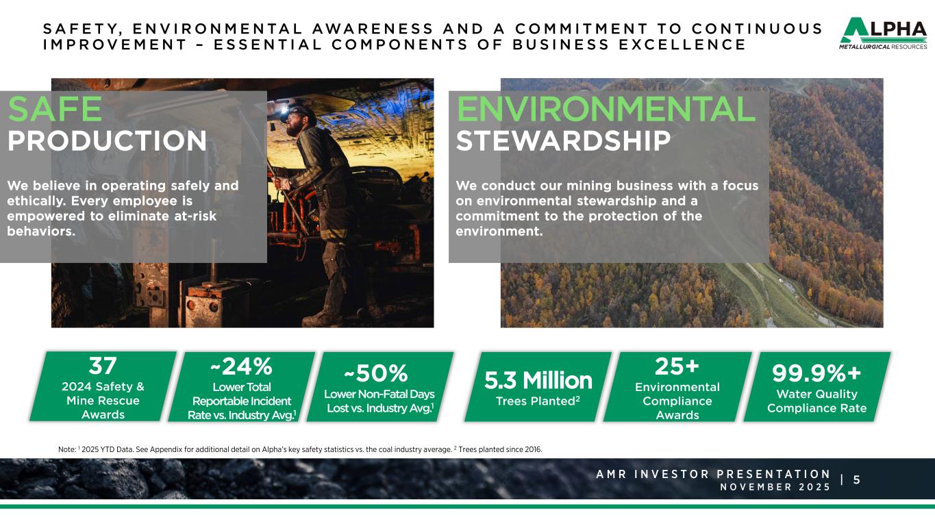 4A M R R a t i n g s A g e n c y P r e s e n t a t i o n J a n u a r y 2 0 2 5 |A M R I N V E S T O R P R E S E N T A T I O N N O V E M B E R  19 Mines  8 Preparation Plants  2 Standalone Loadouts  1 Dock  1 Export Terminal2 WV VA DTA Export Terminal2 Company Mines Processing and Shipping Facilities 76% Export 24% Domestic A L P H A AT A G L A N C E Note: Metrics as of 12/31/24 unless otherwise noted. Employee, mine and plant data as of 9/30/25. 1 For full-year 2024 shipments, by tonnage. 2 65% ownership in DTA Export Terminal. 3 Adjusted EBITDA is a non-GAAP financial measure. A reconciliation of Net Income to Adjusted EBITDA is included in the Appendix. Current Sales Mix 17.1 Million Tons of Coal Sold in 2024 $408 Million Adjusted EBITDA in 20243 #1 US Producer of Met Coal 3,960 Employees Asset Footprint Sales by Shipment Mix1 37% High Vol-A 31% High Vol-B 19% Mid Vol 13% Low Vol Sales by Type1