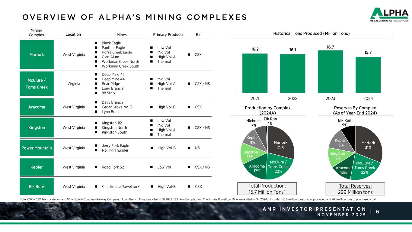 6A M R R a t i n g s A g e n c y P r e s e n t a t i o n J a n u a r y 2 0 2 5 |A M R I N V E S T O R P R E S E N T A T I O N N O V E M B E R OV E RV I E W O F A L P H A’ S M I N I N G CO M P L E X E S Mining Complex Location Rail Marfork West Virginia  Black Eagle  Panther Eagle  Horse Creek Eagle  Glen Alum  Workman Creek North  Workman Creek South  Low Vol  Mid Vol  High Vol-A  Thermal  CSX McClure / Toms Creek Virginia  Deep Mine 41  Deep Mine 44  Bear Ridge  Long Branch1  88 Strip  Mid Vol  High Vol-A  Thermal  CSX / NS Aracoma West Virginia  Davy Branch  Cedar Grove No. 3  Lynn Branch  High Vol-B  CSX Kingston West Virginia  Kingston #2  Kingston North  Kingston South  Low Vol  Mid Vol  High Vol-A  Thermal  CSX / NS Power Mountain West Virginia  Jerry Fork Eagle  Rolling Thunder  High Vol-B  NS Kepler West Virginia  Road Fork 52  Low Vol  CSX / NS Elk Run2 West Virginia  Checkmate Powellton2  High Vol-B  CSX Primary ProductsMines Note: CSX = CSX Transportation and NS = Norfolk Southern Railway Company. 1 Long Branch Mine was idled in Q1 2025. 2 Elk Run Complex and Checkmate Powellton Mine were idled in Q4 2024. 3 Includes ~15.6 million tons of coal produced and ~0.1 million tons of purchased coal. Historical Tons Produced (Million Tons) Production by Complex (2024A) Reserves By Complex (As of Year-End 2024) Marfork 29% McClure / Toms Creek 22% Aracoma 17% Kingston 13% Kepler 11% Nicholas 7% Elk Run 1% Total Production: 15.7 Million Tons3 Total Reserves: 299 Million tons Marfork 31% McClure / Toms Creek 22% Aracoma 13% Kingston 12% Kepler 13% Elk Run 9% 16.2 16.1 16.7 15.7 2021 2022 2023 2024