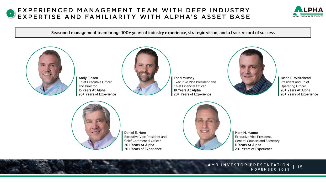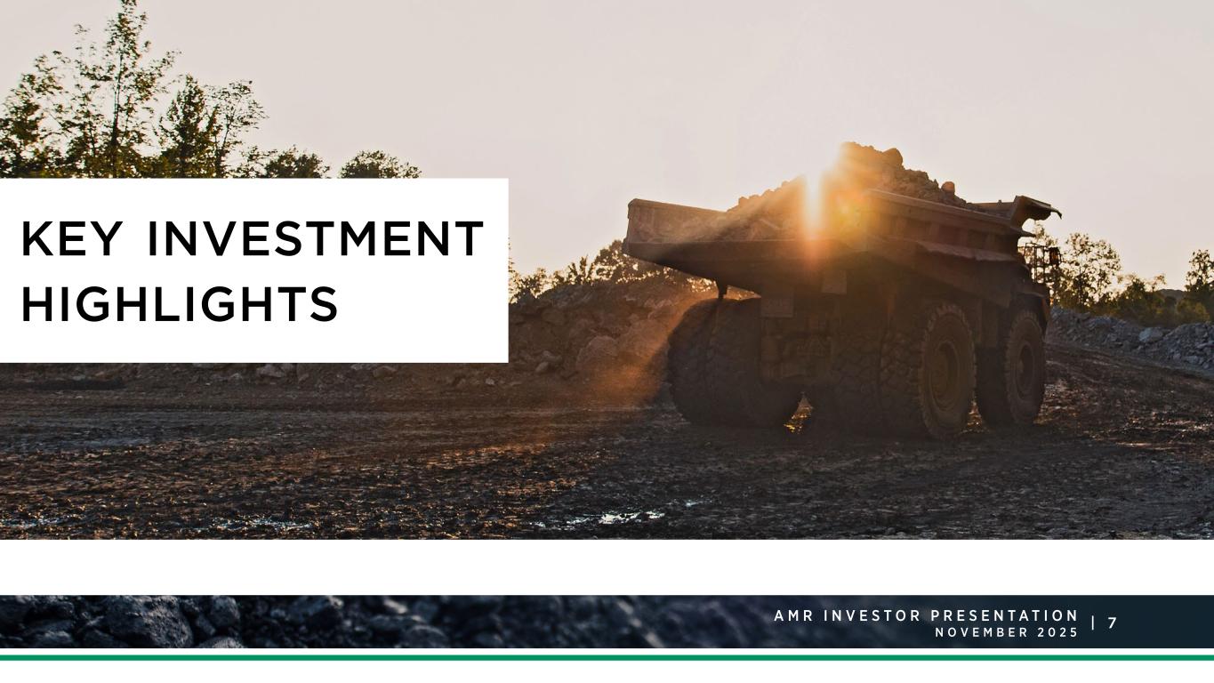 1 4A M R R a t i n g s A g e n c y P r e s e n t a t i o n J a n u a r y 2 0 2 5 |A M R I N V E S T O R P R E S E N T A T I O N N O V E M B E R S T R O N G C U LT U R E O F C O M M I T M E N T T O S A F E T Y, E N V I R O N M E N TA L S T E WA R D S H I P, A N D C O N T I N U O U S I M P R O V E M E N T6 Environmental • Environmental Management Systems • Water Management Systems • Waste Management Systems • Biodiversity Control • “Beyond Compliance” Attitude Social • Safety and Health • Workforce and Operations • Community Involvement • Code of Ethics and Responsibility Governance • Rigorous reporting and documentation standards • Strategic shift away from thermal coal Environmental Awards & Recognition  2024 Best Reclaimed Underground Mine  2023 Exemplary Reclamation of Surface Mining  2023 Exemplary Reclamation of Underground Mining  2023 Best AML Dangerous Highwall Elimination  2022 Underground Reclamation Award  2022 Drainage Control award Outstanding Employee Relations Experienced Leadership Driving Growth  Safety performance is ~43% better than industry average1  Competitive compensation and benefits package  Equal opportunity employer  Strict anti-harassment and anti-discrimination policies  85% workforce retention in 2024  Combined 100+ years of experience across the coal and financial industries  83% Board independence  33% Board gender diversity  Average director age of 58 years  Average board tenure of 3 years Note: 1 Represents 2023 – 2025 YTD average Non-Fatal Days Lost for Alpha of 1.25 vs. 2.21 for the coal industry average.