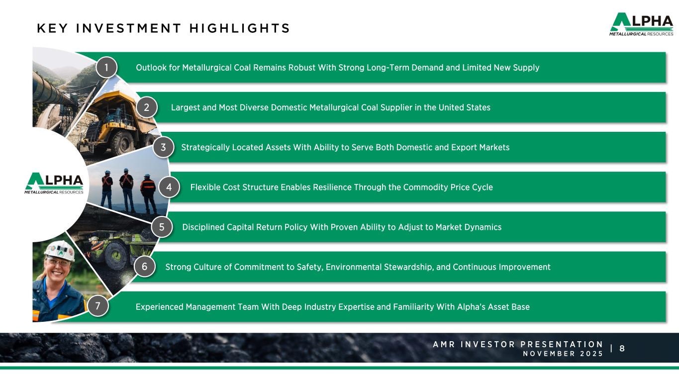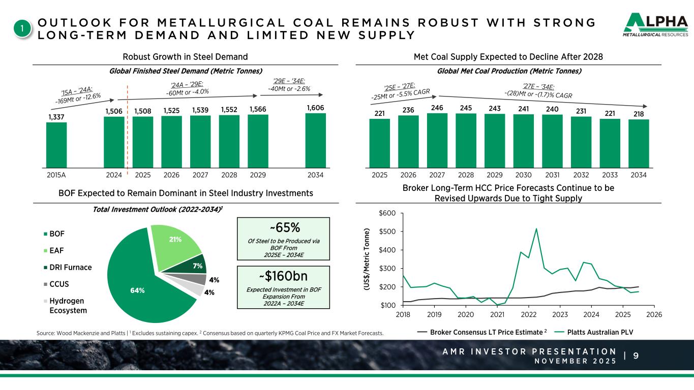 8A M R R a t i n g s A g e n c y P r e s e n t a t i o n J a n u a r y 2 0 2 5 |A M R I N V E S T O R P R E S E N T A T I O N N O V E M B E R K E Y I N V E S T M E N T H I G H L I G H T S Strategically Located Assets With Ability to Serve Both Domestic and Export Markets Experienced Management Team With Deep Industry Expertise and Familiarity With Alpha’s Asset Base Largest and Most Diverse Domestic Metallurgical Coal Supplier in the United States Outlook for Metallurgical Coal Remains Robust With Strong Long-Term Demand and Limited New Supply Flexible Cost Structure Enables Resilience Through the Commodity Price Cycle Strong Culture of Commitment to Safety, Environmental Stewardship, and Continuous Improvement Disciplined Capital Return Policy With Proven Ability to Adjust to Market Dynamics 4 1 2 3 5 6 7