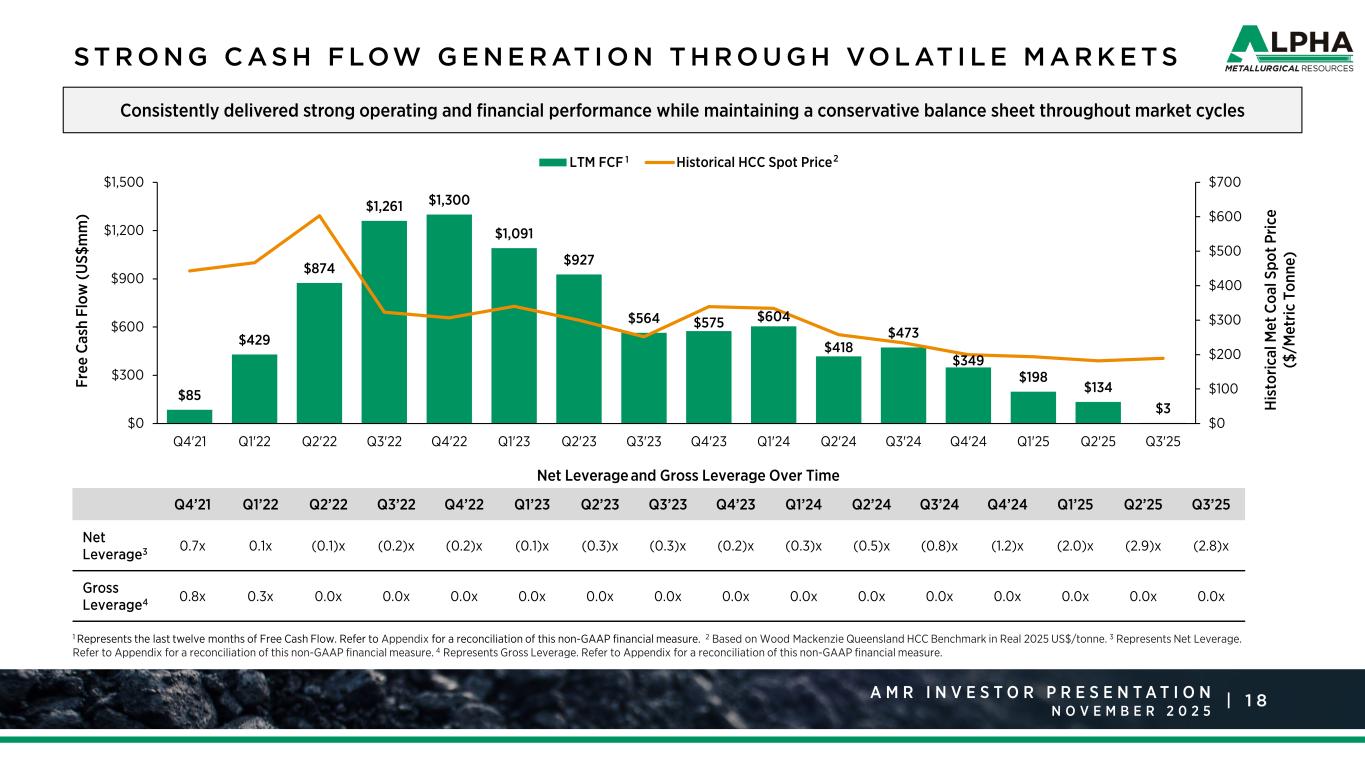 1 8A M R R a t i n g s A g e n c y P r e s e n t a t i o n J a n u a r y 2 0 2 5 |A M R I N V E S T O R P R E S E N T A T I O N N O V E M B E R Q4’21 Q1’22 Q2’22 Q3’22 Q4’22 Q1’23 Q2’23 Q3’23 Q4’23 Q1’24 Q2’24 Q3’24 Q4’24 Q1’25 Q2’25 Q3’25 Net Leverage3 0.7x 0.1x (0.1)x (0.2)x (0.2)x (0.1)x (0.3)x (0.3)x (0.2)x (0.3)x (0.5)x (0.8)x (1.2)x (2.0)x (2.9)x (2.8)x Gross Leverage4 0.8x 0.3x 0.0x 0.0x 0.0x 0.0x 0.0x 0.0x 0.0x 0.0x 0.0x 0.0x 0.0x 0.0x 0.0x 0.0x S T R O N G C AS H F LOW G E N E R AT I O N T H R O U G H VO L AT I L E M A R K E T S Net Leverage and Gross Leverage Over Time 1 Represents the last twelve months of Free Cash Flow. Refer to Appendix for a reconciliation of this non-GAAP financial measure. 2 Based on Wood Mackenzie Queensland HCC Benchmark in Real 2025 US$/tonne. 3 Represents Net Leverage. Refer to Appendix for a reconciliation of this non-GAAP financial measure. 4 Represents Gross Leverage. Refer to Appendix for a reconciliation of this non-GAAP financial measure. Consistently delivered strong operating and financial performance while maintaining a conservative balance sheet throughout market cycles $85 $429 $874 $1,261 $1,300 $1,091 $927 $564 $575 $604 $418 $473 $349 $198 $134 $3 $0 $100 $200 $300 $400 $500 $600 $700 $0 $300 $600 $900 $1,200 $1,500 Q4'21 Q1'22 Q2'22 Q3'22 Q4'22 Q1'23 Q2'23 Q3'23 Q4'23 Q1'24 Q2'24 Q3'24 Q4'24 Q1'25 Q2'25 Q3'25 H is to ric al M et C oa l S po t P ric e ($ /M et ric T on ne ) Fr ee C as h Fl ow (U S$ m m ) LTM FCF Historical HCC Spot Price1 2