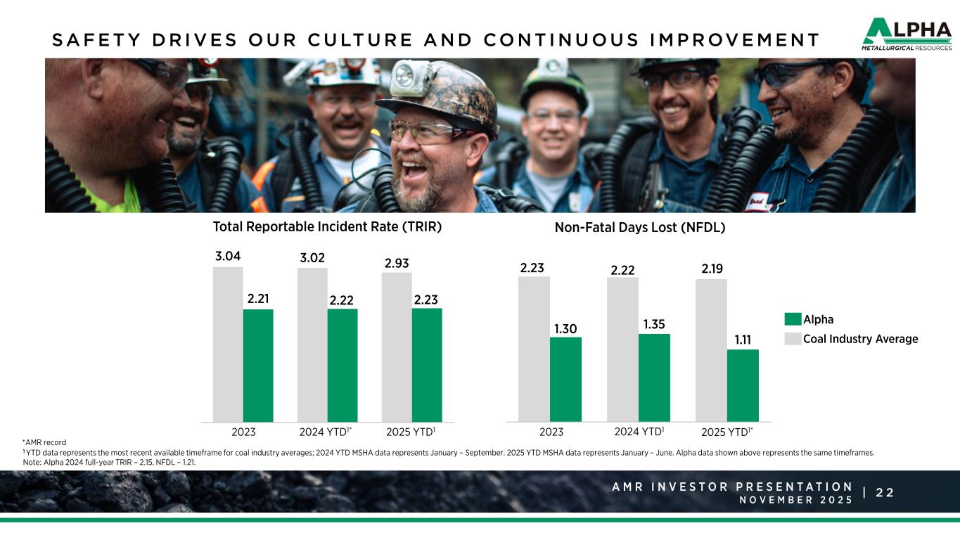 1 0A M R R a t i n g s A g e n c y P r e s e n t a t i o n J a n u a r y 2 0 2 5 |A M R I N V E S T O R P R E S E N T A T I O N N O V E M B E R Metallurgical Coal Sold (2024A, Million tons) Number of Coal Operating Complexes (Global) 6 3 4 1 4 Steel-Making Coal Types Sold  Low Vol  Mid Vol  High Vol-A/B  Low Vol  Mid Vol  High Vol-A/B  SCC  PCI  Low Vol  High Vol-A/B  Low Vol  High Vol-A  High Vol-A  PCI  SHCC Primary End Markets Asia, Europe, North America Asia, North America, Europe North America, Asia, Europe Europe, Asia Asia, North America 17.1 13.8 12.0 8.2 7.3 Source: 1 Based on 12.0 million short tons of metallurgical and crossover coal sales per year on a normalized basis as provided in May-2025 investor presentation. L A R G E S T A N D M O S T D I V E R S E D O M E S T I C M E TA L LU R G I C A L COA L S U P P L I E R I N T H E U N I T E D S TAT E S 2 1