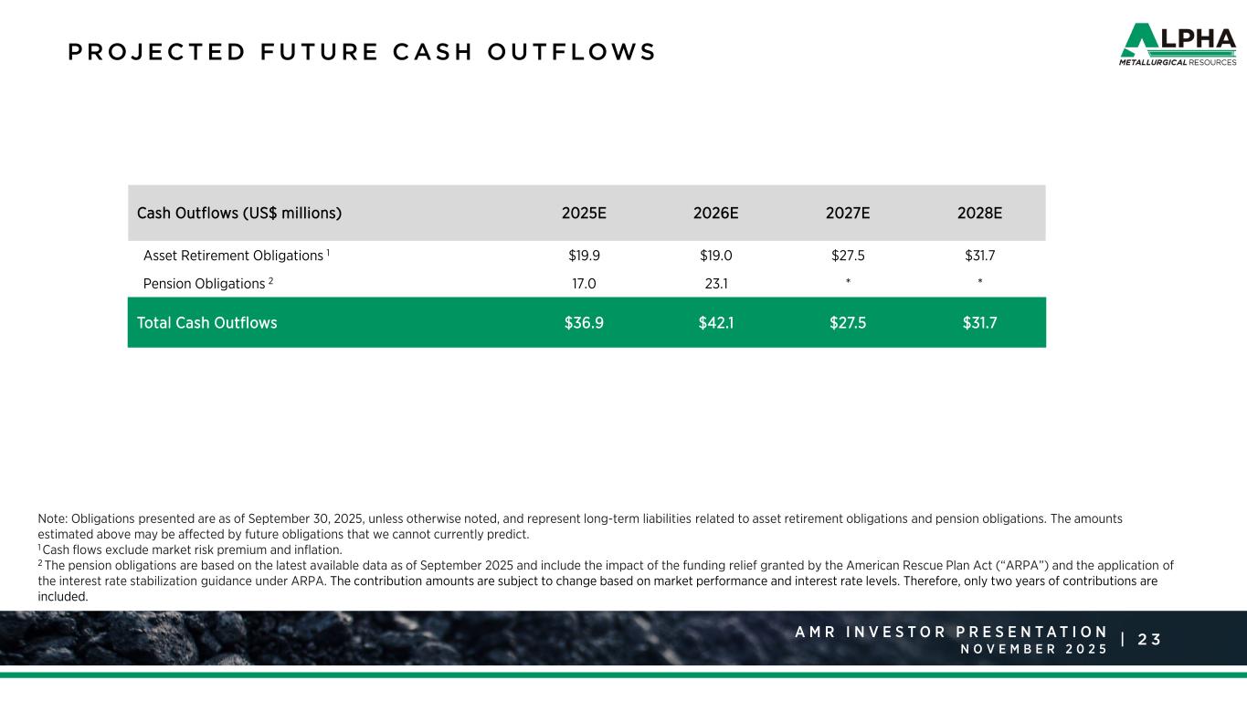 2 3A M R R a t i n g s A g e n c y P r e s e n t a t i o n J a n u a r y 2 0 2 5 |A M R I N V E S T O R P R E S E N T A T I O N N O V E M B E R P R OJ E C T E D F U T U R E C AS H O U T F LOWS Note: Obligations presented are as of September 30, 2025, unless otherwise noted, and represent long-term liabilities related to asset retirement obligations and pension obligations. The amounts estimated above may be affected by future obligations that we cannot currently predict. 1 Cash flows exclude market risk premium and inflation. 2 The pension obligations are based on the latest available data as of September 2025 and include the impact of the funding relief granted by the American Rescue Plan Act (“ARPA”) and the application of the interest rate stabilization guidance under ARPA. The contribution amounts are subject to change based on market performance and interest rate levels. Therefore, only two years of contributions are included. Cash Outflows (US$ millions) 2025E 2026E 2027E 2028E Asset Retirement Obligations 1 $19.9 $19.0 $27.5 $31.7 Pension Obligations 2 17.0 23.1 * * Total Cash Outflows $36.9 $42.1 $27.5 $31.7