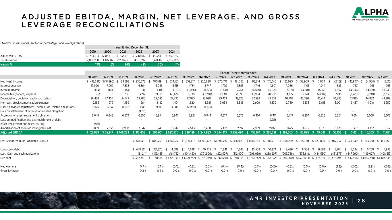 2 7A M R R a t i n g s A g e n c y P r e s e n t a t i o n J a n u a r y 2 0 2 5 |A M R I N V E S T O R P R E S E N T A T I O N N O V E M B E R A DJ U S T E D E B I T DA R E CO N C I L I AT I O N 1 The 2019 and 2020 periods only include continuing operations. (Amounts in thousands) 2019 2020 2021 2022 2023 2024 Net (loss) income 1 (219,618)$ (241,470)$ 288,790$ 1,448,545$ 721,956$ 187,579$ Interest expense 67,521 74,528 69,654 21,802 6,923 3,811 Interest income (7,247) (7,027) (336) (3,187) (11,933) (18,208) Income tax (benefit) expense (53,287) (2,164) 3,408 106,205 123,503 23,171 Depreciation, depletion and amortization 215,757 139,885 110,047 107,620 136,869 167,331 Merger-related costs 1,090 - - - - - Non-cash stock compensation expense 12,348 4,896 5,315 7,484 19,017 12,318 Mark-to-market adjustment - acquisition-related obligations (3,564) (8,750) 19,525 8,880 - - Gain on settlement of acquisition-related obligation - - (1,125) - - - Accretion on asset retirement obligations 23,865 26,504 26,520 23,765 25,500 25,050 Loss on modification and extinguishment of debt 26,459 - - - 2,753 - Asset impairment and restructuring 66,324 83,878 (561) - - - Goodwill impairment 124,353 - - - - - Cost impact of coal inventory fair value adjustment 8,209 - - - - - Gain on assets acquired in an exchange transaction (9,083) - - - - - Management restructuring costs 7,720 941 - - - - Loss on partial settlement of benefit obligations 6,446 2,966 - - - - Amortization of acquired intangibles, net (3,189) 9,214 13,244 19,498 8,523 6,700 Adjusted EBITDA 264,104$ 83,401$ 534,481$ 1,740,612$ 1,033,111$ 407,752$ Year Ended December 31,