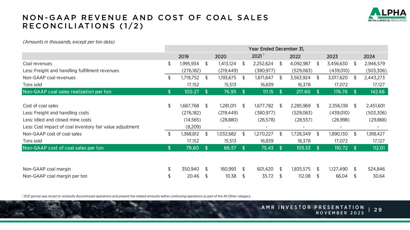 2 4A M R R a t i n g s A g e n c y P r e s e n t a t i o n J a n u a r y 2 0 2 5 |A M R I N V E S T O R P R E S E N T A T I O N N O V E M B E R 1 Based on committed and priced coal shipments as of October 29, 2025. Committed percentage based on the midpoint of shipment guidance range. 2 Actual average per-ton realizations on committed and priced tons recognized in future periods may vary based on actual freight expense in future periods relative to assumed freight expense embedded in projected average per-ton realizations. 3 Includes estimates of future coal shipments based upon contract terms and anticipated delivery schedules. Actual coal shipments may vary from these estimates. 4 Note: The Company is unable to present a quantitative reconciliation of its forward-looking non-GAAP cost of coal sales per ton sold financial measures to the most directly comparable GAAP measures without unreasonable efforts due to the inherent difficulty in forecasting and quantifying with reasonable accuracy significant items required for the reconciliation. The most directly comparable GAAP measure, GAAP cost of sales, is not accessible without unreasonable efforts on a forward-looking basis. The reconciling items include freight and handling costs, which are a component of GAAP cost of sales. Management is unable to predict without unreasonable efforts freight and handling costs due to uncertainty as to the end market and FOB point for uncommitted sales volumes and the final shipping point for export shipments. These amounts have varied historically and may continue to vary significantly from quarter to quarter and material changes to these items could have a significant effect on our future GAAP results. 5 Excludes expenses related to non-cash stock compensation and non-recurring expenses. 6 Includes contributions to fund normal operations at our DTA export facility and expected capital investments related to the facility upgrades. G U I DA N C E A S O F N OV E M B E R 6 , 2 0 2 5 Shipments (million tons) Low High Metallurgical 13.8 14.8 Non-Metallurgical Byproduct 0.8 1.2 Met Segment - Total Shipments 14.6 16.0 Committed / Priced Volumes 1, 2, 3 % Committed Average Price ($/ton) Metallurgical - Domestic $152.25 Metallurgical - Export $110.84 Metallurgical Total 85% $122.57 Non-Metallurgical Byproduct 100% $80.27 Met Segment 87% $118.97 Cost per ton ($/ton) 4 Low High Met Segment $101.00 $107.00 Other Items (US$ millions, except taxes) Low High SG&A 5 $48 $54 Idle Operations Expense $21 $29 Net Cash Interest Income $6 $12 DD&A $165 $185 Capital Expenditures $130 $150 Capital Contributions to Equity Affiliates 6 $35 $41 Cash Tax Rate 0% 5%