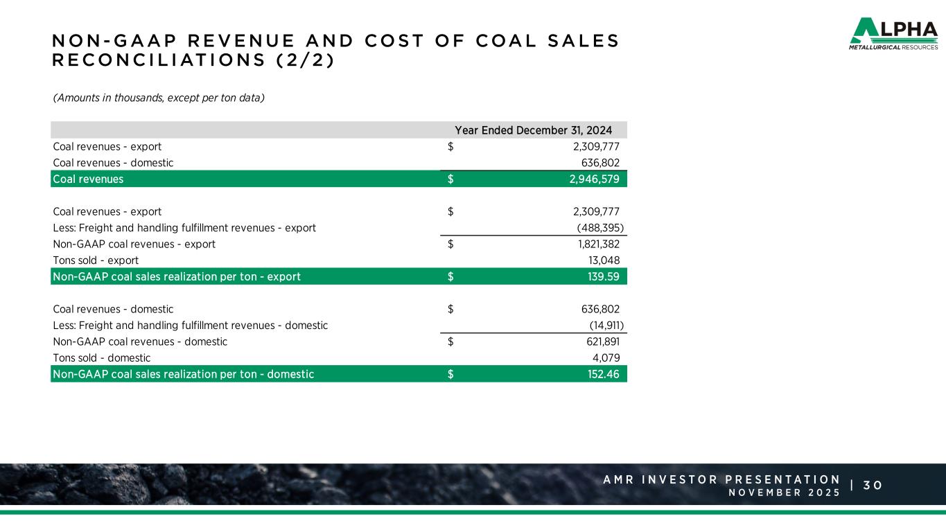 2 9A M R R a t i n g s A g e n c y P r e s e n t a t i o n J a n u a r y 2 0 2 5 |A M R I N V E S T O R P R E S E N T A T I O N N O V E M B E R N O N - G AA P R E V E N U E A N D CO S T O F COA L S A L E S R E CO N C I L I AT I O N S ( 1 /2 ) 1 2021 period was recast to reclassify discontinued operations and present the related amounts within continuing operations as part of the All Other category. (Amounts in thousands, except per ton data) 2019 2020 2021 1 2022 2023 2024 Coal revenues 1,995,934$ 1,413,124$ 2,252,624$ 4,092,987$ 3,456,630$ 2,946,579$ Less: Freight and handling fulfillment revenues (276,182) (219,449) (380,977) (529,063) (439,010) (503,306) Non-GAAP coal revenues 1,719,752$ 1,193,675$ 1,871,647$ 3,563,924$ 3,017,620$ 2,443,273$ Tons sold 17,152 15,513 16,839 16,378 17,072 17,127 Non-GAAP coal sales realization per ton 100.27$ 76.95$ 111.15$ 217.60$ 176.76$ 142.66$ Cost of coal sales 1,667,768$ 1,281,011$ 1,677,782$ 2,285,969$ 2,356,138$ 2,451,601$ Less: Freight and handling costs (276,182) (219,449) (380,977) (529,063) (439,010) (503,306) Less: Idled and closed mine costs (14,565) (28,880) (26,578) (28,557) (26,998) (29,868) Less: Cost impact of coal inventory fair value adjustment (8,209) - - - - - Non-GAAP cost of coal sales 1,368,812$ 1,032,682$ 1,270,227$ 1,728,349$ 1,890,130$ 1,918,427$ Tons sold 17,152 15,513 16,839 16,378 17,072 17,127 Non-GAAP cost of coal sales per ton 79.80$ 66.57$ 75.43$ 105.53$ 110.72$ 112.01$ Non-GAAP coal margin 350,940$ 160,993$ 601,420$ 1,835,575$ 1,127,490$ 524,846$ Non-GAAP coal margin per ton 20.46$ 10.38$ 35.72$ 112.08$ 66.04$ 30.64$ Year Ended December 31,