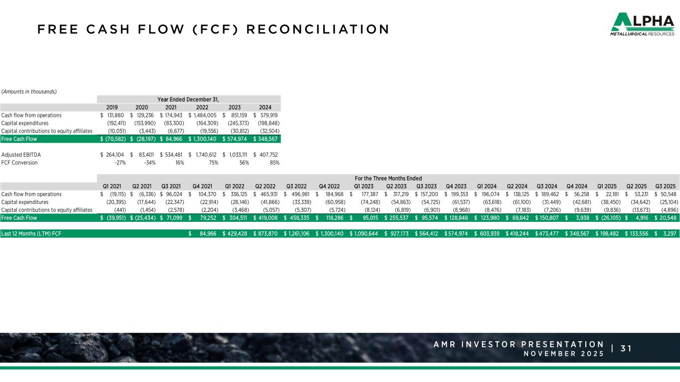 3 0A M R R a t i n g s A g e n c y P r e s e n t a t i o n J a n u a r y 2 0 2 5 |A M R I N V E S T O R P R E S E N T A T I O N N O V E M B E R N O N - G AA P R E V E N U E A N D CO S T O F COA L S A L E S R E CO N C I L I AT I O N S ( 2 /2 ) (Amounts in thousands, except per ton data) Year Ended December 31, 2024 Coal revenues - export 2,309,777$ Coal revenues - domestic 636,802 Coal revenues 2,946,579$ Coal revenues - export 2,309,777$ Less: Freight and handling fulfillment revenues - export (488,395) Non-GAAP coal revenues - export 1,821,382$ Tons sold - export 13,048 Non-GAAP coal sales realization per ton - export 139.59$ Coal revenues - domestic 636,802$ Less: Freight and handling fulfillment revenues - domestic (14,911) Non-GAAP coal revenues - domestic 621,891$ Tons sold - domestic 4,079 Non-GAAP coal sales realization per ton - domestic 152.46$