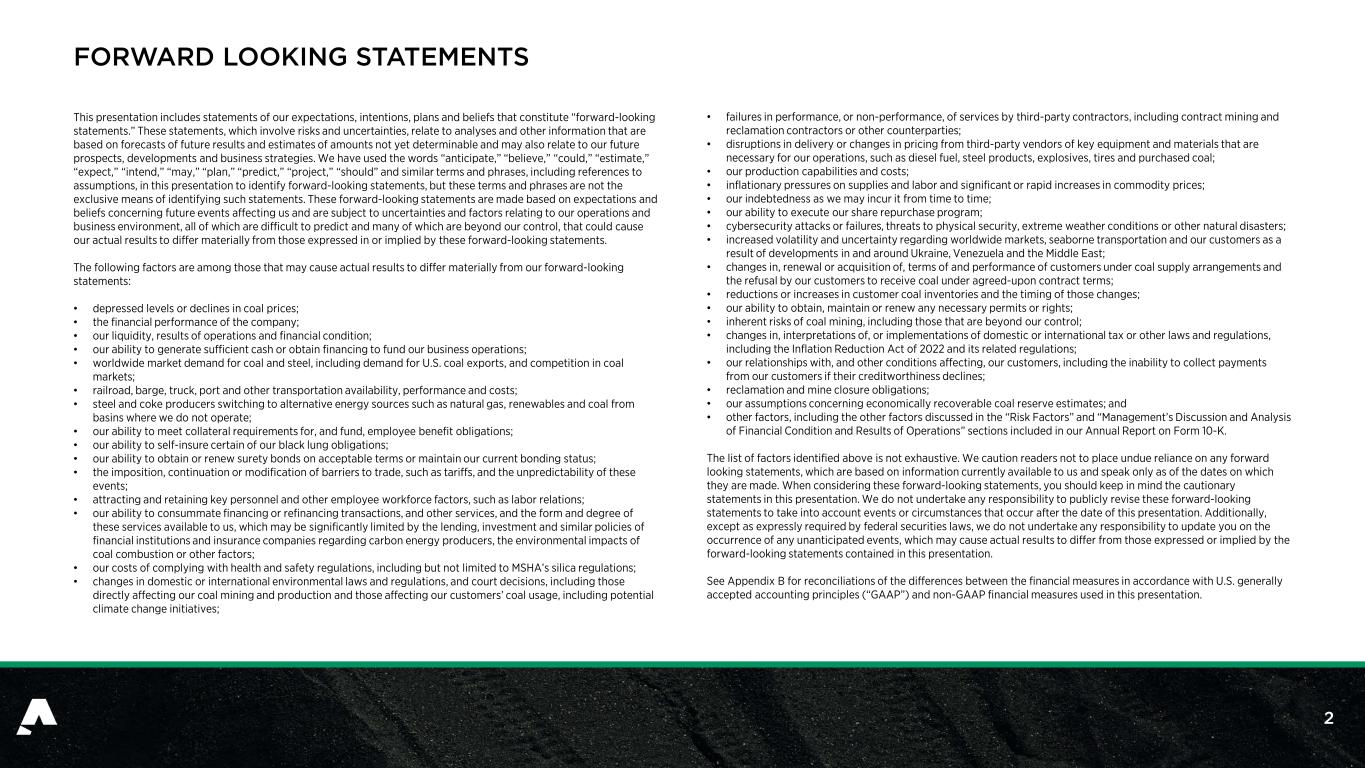 2 FORWARD LOOKING STATEMENTS This presentation includes statements of our expectations, intentions, plans and beliefs that constitute “forward-looking statements.” These statements, which involve risks and uncertainties, relate to analyses and other information that are based on forecasts of future results and estimates of amounts not yet determinable and may also relate to our future prospects, developments and business strategies. We have used the words “anticipate,” “believe,” “could,” “estimate,” “expect,” “intend,” “may,” “plan,” “predict,” “project,” “should” and similar terms and phrases, including references to assumptions, in this presentation to identify forward-looking statements, but these terms and phrases are not the exclusive means of identifying such statements. These forward-looking statements are made based on expectations and beliefs concerning future events affecting us and are subject to uncertainties and factors relating to our operations and business environment, all of which are difficult to predict and many of which are beyond our control, that could cause our actual results to differ materially from those expressed in or implied by these forward-looking statements. The following factors are among those that may cause actual results to differ materially from our forward-looking statements: • depressed levels or declines in coal prices; • the financial performance of the company; • our liquidity, results of operations and financial condition; • our ability to generate sufficient cash or obtain financing to fund our business operations; • worldwide market demand for coal and steel, including demand for U.S. coal exports, and competition in coal markets; • railroad, barge, truck, port and other transportation availability, performance and costs; • steel and coke producers switching to alternative energy sources such as natural gas, renewables and coal from basins where we do not operate; • our ability to meet collateral requirements for, and fund, employee benefit obligations; • our ability to self-insure certain of our black lung obligations; • our ability to obtain or renew surety bonds on acceptable terms or maintain our current bonding status; • the imposition, continuation or modification of barriers to trade, such as tariffs, and the unpredictability of these events; • attracting and retaining key personnel and other employee workforce factors, such as labor relations; • our ability to consummate financing or refinancing transactions, and other services, and the form and degree of these services available to us, which may be significantly limited by the lending, investment and similar policies of financial institutions and insurance companies regarding carbon energy producers, the environmental impacts of coal combustion or other factors; • our costs of complying with health and safety regulations, including but not limited to MSHA’s silica regulations; • changes in domestic or international environmental laws and regulations, and court decisions, including those directly affecting our coal mining and production and those affecting our customers’ coal usage, including potential climate change initiatives; • failures in performance, or non-performance, of services by third-party contractors, including contract mining and reclamation contractors or other counterparties; • disruptions in delivery or changes in pricing from third-party vendors of key equipment and materials that are necessary for our operations, such as diesel fuel, steel products, explosives, tires and purchased coal; • our production capabilities and costs; • inflationary pressures on supplies and labor and significant or rapid increases in commodity prices; • our indebtedness as we may incur it from time to time; • our ability to execute our share repurchase program; • cybersecurity attacks or failures, threats to physical security, extreme weather conditions or other natural disasters; • increased volatility and uncertainty regarding worldwide markets, seaborne transportation and our customers as a result of developments in and around Ukraine, Venezuela and the Middle East; • changes in, renewal or acquisition of, terms of and performance of customers under coal supply arrangements and the refusal by our customers to receive coal under agreed-upon contract terms; • reductions or increases in customer coal inventories and the timing of those changes; • our ability to obtain, maintain or renew any necessary permits or rights; • inherent risks of coal mining, including those that are beyond our control; • changes in, interpretations of, or implementations of domestic or international tax or other laws and regulations, including the Inflation Reduction Act of 2022 and its related regulations; • our relationships with, and other conditions affecting, our customers, including the inability to collect payments from our customers if their creditworthiness declines; • reclamation and mine closure obligations; • our assumptions concerning economically recoverable coal reserve estimates; and • other factors, including the other factors discussed in the “Risk Factors” and “Management’s Discussion and Analysis of Financial Condition and Results of Operations” sections included in our Annual Report on Form 10-K. The list of factors identified above is not exhaustive. We caution readers not to place undue reliance on any forward looking statements, which are based on information currently available to us and speak only as of the dates on which they are made. When considering these forward-looking statements, you should keep in mind the cautionary statements in this presentation. We do not undertake any responsibility to publicly revise these forward-looking statements to take into account events or circumstances that occur after the date of this presentation. Additionally, except as e