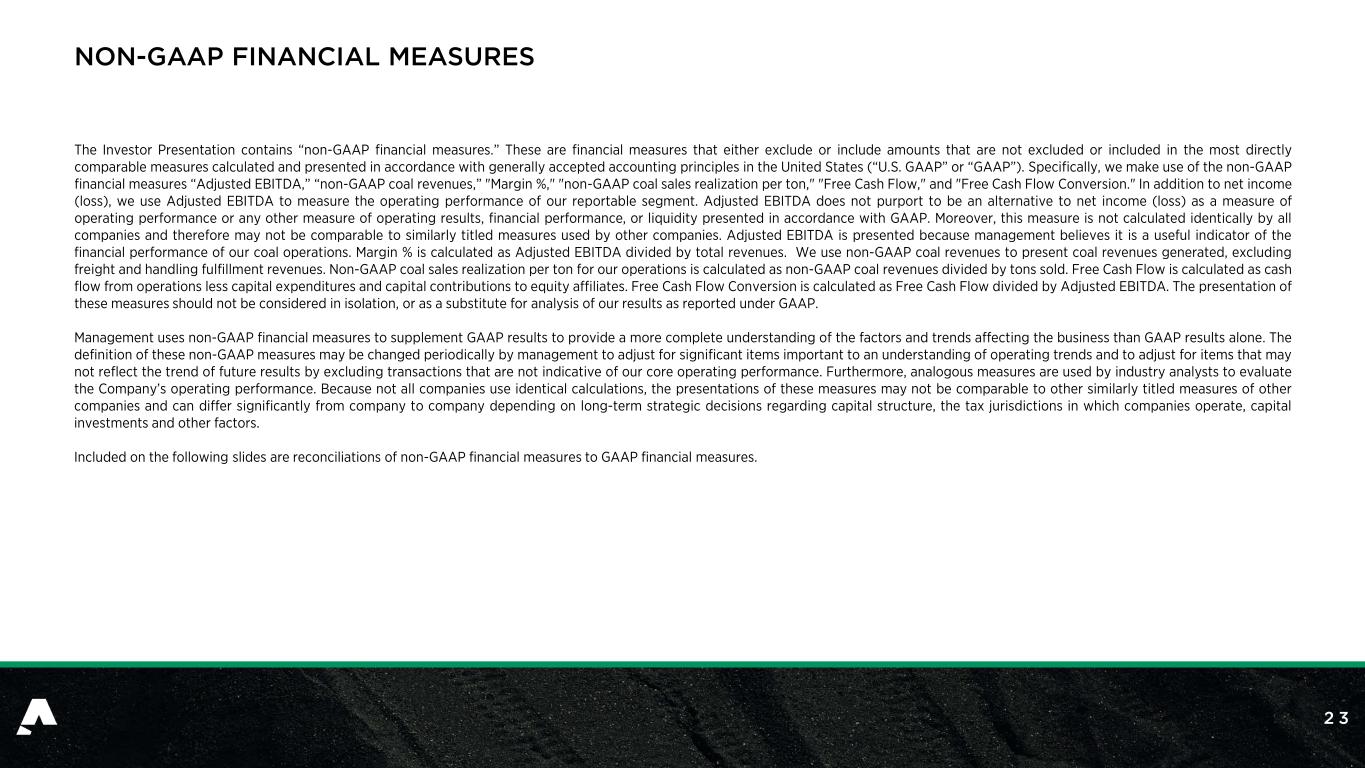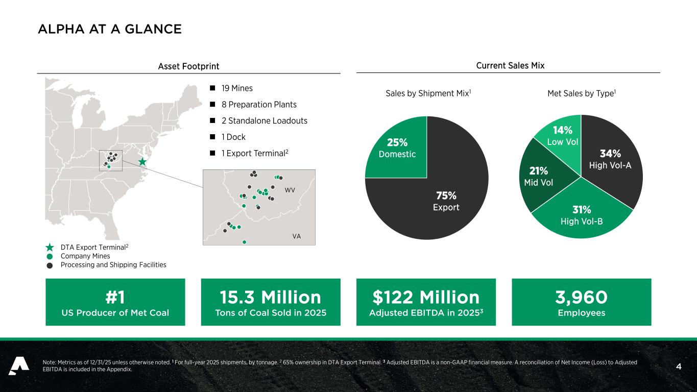 2 3 NON-GAAP FINANCIAL MEASURES The Investor Presentation contains “non-GAAP financial measures.” These are financial measures that either exclude or include amounts that are not excluded or included in the most directly comparable measures calculated and presented in accordance with generally accepted accounting principles in the United States (“U.S. GAAP” or “GAAP”). Specifically, we make use of the non-GAAP financial measures “Adjusted EBITDA,” “non-GAAP coal revenues,” "Margin %," "non-GAAP coal sales realization per ton," "Free Cash Flow," and "Free Cash Flow Conversion." In addition to net income (loss), we use Adjusted EBITDA to measure the operating performance of our reportable segment. Adjusted EBITDA does not purport to be an alternative to net income (loss) as a measure of operating performance or any other measure of operating results, financial performance, or liquidity presented in accordance with GAAP. Moreover, this measure is not calculated identically by all companies and therefore may not be comparable to similarly titled measures used by other companies. Adjusted EBITDA is presented because management believes it is a useful indicator of the financial performance of our coal operations. Margin % is calculated as Adjusted EBITDA divided by total revenues. We use non-GAAP coal revenues to present coal revenues generated, excluding freight and handling fulfillment revenues. Non-GAAP coal sales realization per ton for our operations is calculated as non-GAAP coal revenues divided by tons sold. Free Cash Flow is calculated as cash flow from operations less capital expenditures and capital contributions to equity affiliates. Free Cash Flow Conversion is calculated as Free Cash Flow divided by Adjusted EBITDA. The presentation of these measures should not be considered in isolation, or as a substitute for analysis of our results as reported under GAAP. Management uses non-GAAP financial measures to supplement GAAP results to provide a more complete understanding of the factors and trends affecting the business than GAAP results alone. The definition of these non-GAAP measures may be changed periodically by management to adjust for significant items important to an understanding of operating trends and to adjust for items that may not reflect the trend of future results by excluding transactions that are not indicative of our core operating performance. Furthermore, analogous measures are used by industry analysts to evaluate the Company’s operating performance. Because not all companies use identical calculations, the presentations of these measures may not be comparable to other similarly titled measures of other companies and can differ significantly from company to company depending on long-term strategic decisions regarding capital structure, the tax jurisdictions in which companies operate, capital investments and other factors. Included on the following slides are reconciliations of non-GAAP financial measures to GAAP financial measures.