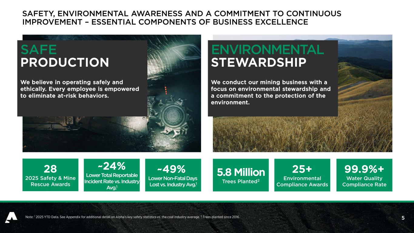 4  19 Mines  8 Preparation Plants  2 Standalone Loadouts  1 Dock  1 Export Terminal2 WV VA DTA Export Terminal2 Company Mines Processing and Shipping Facilities 75% Export 25% Domestic ALPHA AT A GLANCE Note: Metrics as of 12/31/25 unless otherwise noted. 1 For full-year 2025 shipments, by tonnage. 2 65% ownership in DTA Export Terminal. 3 Adjusted EBITDA is a non-GAAP financial measure. A reconciliation of Net Income (Loss) to Adjusted EBITDA is included in the Appendix. Current Sales Mix 15.3 Million Tons of Coal Sold in 2025 $122 Million Adjusted EBITDA in 20253 #1 US Producer of Met Coal 3,960 Employees Asset Footprint Sales by Shipment Mix1 34% High Vol-A 31% High Vol-B 21% Mid Vol 14% Low Vol Met Sales by Type1