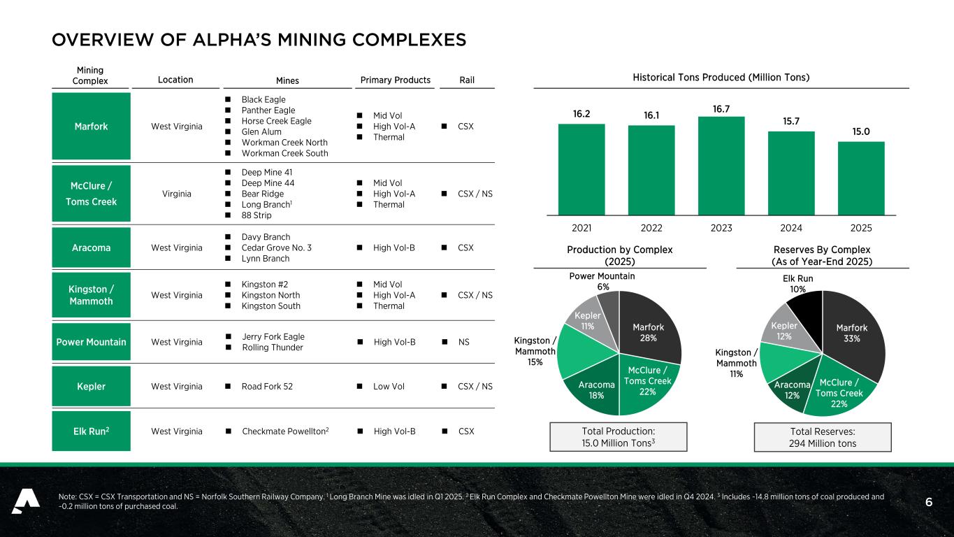 5 SAFETY, ENVIRONMENTAL AWARENESS AND A COMMITMENT TO CONTINUOUS IMPROVEMENT – ESSENTIAL COMPONENTS OF BUSINESS EXCELLENCE Note: 1 2025 YTD Data. See Appendix for additional detail on Alpha’s key safety statistics vs. the coal industry average. 2 Trees planted since 2016. ~24% Lower Total Reportable Incident Rate vs. Industry Avg.1 ~49% Lower Non-Fatal Days Lost vs. Industry Avg.1 28 2025 Safety & Mine Rescue Awards 5.8 Million Trees Planted2 25+ Environmental Compliance Awards 99.9%+ Water Quality Compliance Rate SAFE PRODUCTION We believe in operating safely and ethically. Every employee is empowered to eliminate at-risk behaviors. ENVIRONMENTAL STEWARDSHIP We conduct our mining business with a focus on environmental stewardship and a commitment to the protection of the environment.