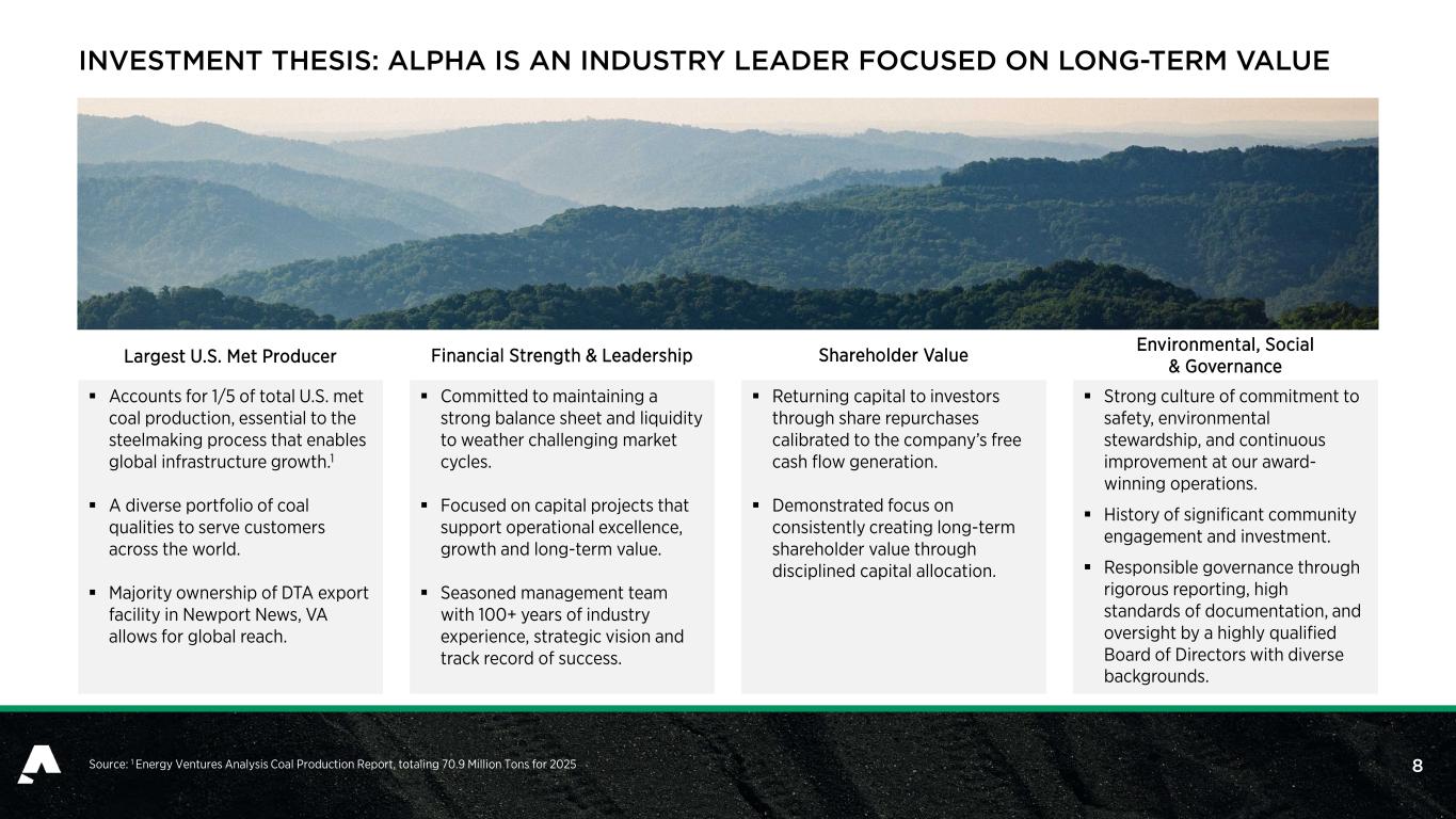 1 7 $154.0 $83.3 $164.3 $245.4 $198.8 $127.2 $158.0 $0 $25 $50 $75 $100 $125 $150 $175 $200 $225 $250 $275 2020A 2021A 2022A 2023A 2024A 2025A 2026E Carryover 2 $11.5 Million – 2026E 1 Maintenance Capex $137 Million – 2026E 1 Development Projects $9.5 Million – 2026E 1 In m ill io ns DISCIPLINED CAPITAL EXPENDITURES WITH ABILITY TO ADJUST TO MARKET NEEDS Alpha’s Capital Expenditures (US$mm) Note: 1 Midpoint of guidance. 2 Carryover reflects capex intended to be spent in 2025 that was delayed due to timing and availability of supplies and contract labor. 1 Alpha Capex Overview  Alpha has shown the ability to adjust its capex spend based on market dynamics and reduce cash outlays in a downside pricing environment  Currently developing Kingston Wildcat (previously named Kingston Sewell), a new underground mine in Fayette County, West Virginia — Mine is expected to produce a low- volatile product — Finishing development build-out prior to production; estimating ~500k tons in 2026, ramping up to full run rate of ~900k tons expected in 2027