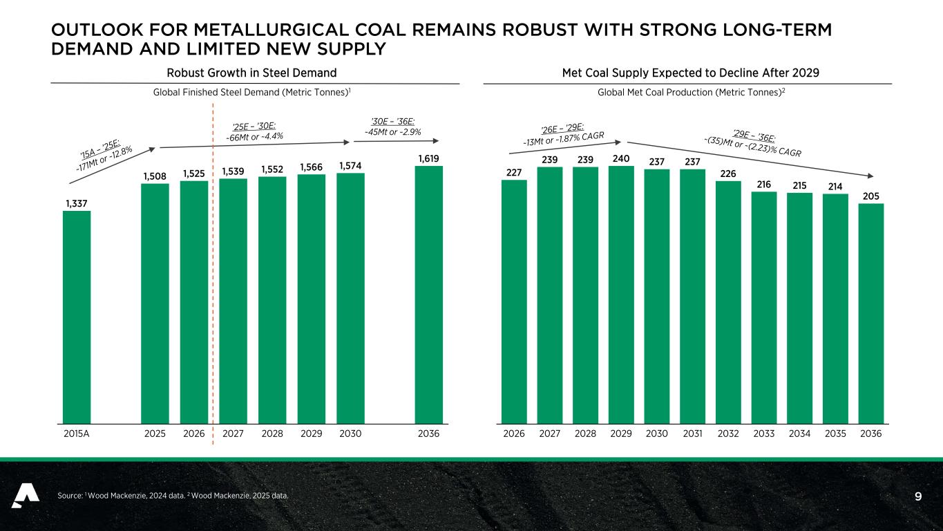 8  Accounts for 1/5 of total U.S. met coal production, essential to the steelmaking process that enables global infrastructure growth.1  A diverse portfolio of coal qualities to serve customers across the world.  Majority ownership of DTA export facility in Newport News, VA allows for global reach.  Committed to maintaining a strong balance sheet and liquidity to weather challenging market cycles.  Focused on capital projects that support operational excellence, growth and long-term value.  Seasoned management team with 100+ years of industry experience, strategic vision and track record of success.  Returning capital to investors through share repurchases calibrated to the company’s free cash flow generation.  Demonstrated focus on consistently creating long-term shareholder value through disciplined capital allocation.  Strong culture of commitment to safety, environmental stewardship, and continuous improvement at our award- winning operations.  History of significant community engagement and investment.  Responsible governance through rigorous reporting, high standards of documentation, and oversight by a highly qualified Board of Directors with diverse backgrounds. Largest U.S. Met Producer Shareholder Value Environmental, Social & GovernanceFinancial Strength & Leadership INVESTMENT THESIS: ALPHA IS AN INDUSTRY LEADER FOCUSED ON LONG-TERM VALUE Source: 1 Energy Ventures Analysis Coal Production Report, totaling 70.9 Million Tons for 2025