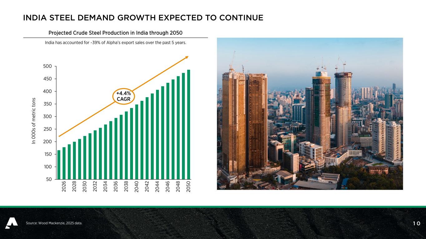 9 ’30E – ’36E: ~45Mt or ~2.9% Source: 1 Wood Mackenzie, 2024 data. 2 Wood Mackenzie, 2025 data. Robust Growth in Steel Demand Global Finished Steel Demand (Metric Tonnes)1 Met Coal Supply Expected to Decline After 2029 Global Met Coal Production (Metric Tonnes)2 OUTLOOK FOR METALLURGICAL COAL REMAINS ROBUST WITH STRONG LONG-TERM DEMAND AND LIMITED NEW SUPPLY 227 239 239 240 237 237 226 216 215 214 205 2026 2027 2028 2029 2030 2031 2032 2033 2034 2035 2036 1,337 1,508 1,525 1,539 1,552 1,566 1,574 1,619 2015A 2025 2026 2027 2028 2029 2030 2036