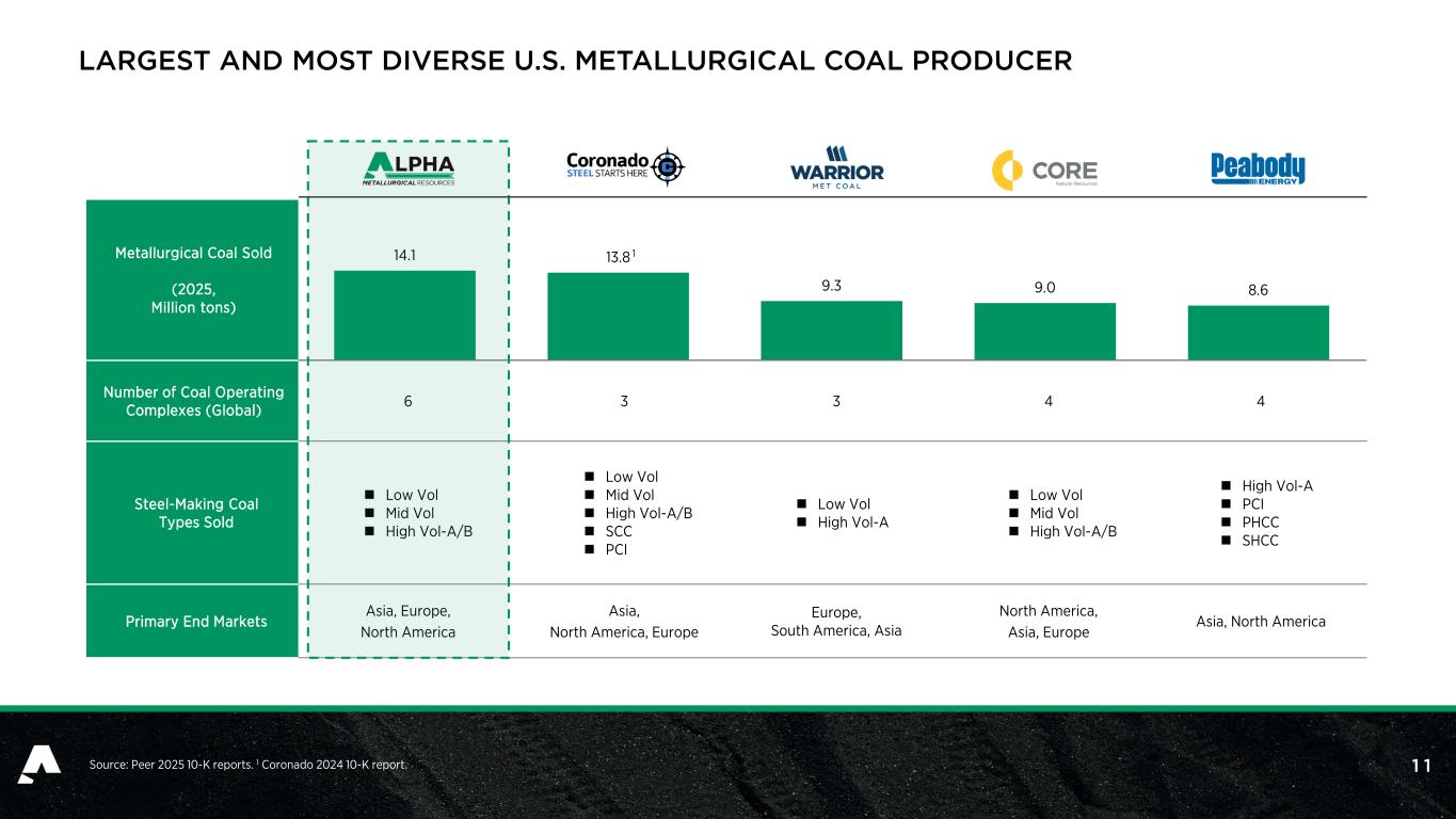 1 1 Metallurgical Coal Sold (2025, Million tons) Number of Coal Operating Complexes (Global) 6 3 3 4 4 Steel-Making Coal Types Sold  Low Vol  Mid Vol  High Vol-A/B  Low Vol  Mid Vol  High Vol-A/B  SCC  PCI  Low Vol  High Vol-A  Low Vol  Mid Vol  High Vol-A/B  High Vol-A  PCI  PHCC  SHCC Primary End Markets Asia, Europe, North America Asia, North America, Europe Europe, South America, Asia North America, Asia, Europe Asia, North America 14.1 13.8 9.3 9.0 8.6 Source: Peer 2025 10-K reports. 1 Coronado 2024 10-K report. LARGEST AND MOST DIVERSE U.S. METALLURGICAL COAL PRODUCER 1