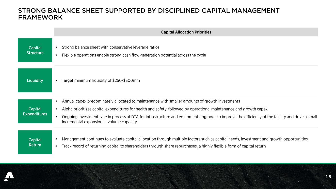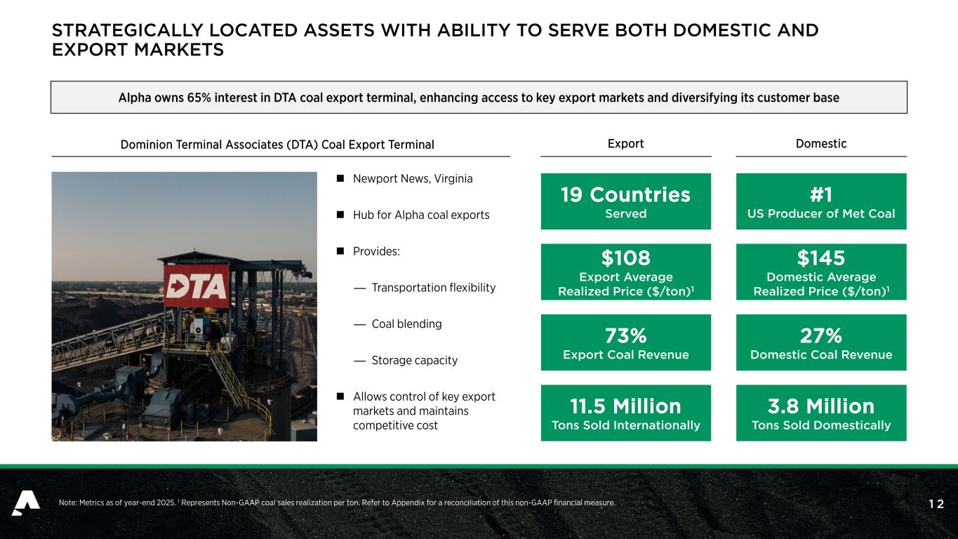 1 2 STRATEGICALLY LOCATED ASSETS WITH ABILITY TO SERVE BOTH DOMESTIC AND EXPORT MARKETS Note: Metrics as of year-end 2025. 1 Represents Non-GAAP coal sales realization per ton. Refer to Appendix for a reconciliation of this non-GAAP financial measure. Dominion Terminal Associates (DTA) Coal Export Terminal 27% Domestic Coal Revenue $145 Domestic Average Realized Price ($/ton)1 Domestic #1 US Producer of Met Coal 3.8 Million Tons Sold Domestically 73% Export Coal Revenue $108 Export Average Realized Price ($/ton)1 Export 19 Countries Served 11.5 Million Tons Sold Internationally Alpha owns 65% interest in DTA coal export terminal, enhancing access to key export markets and diversifying its customer base  Newport News, Virginia  Hub for Alpha coal exports  Provides: — Transportation flexibility — Coal blending — Storage capacity  Allows control of key export markets and maintains competitive cost