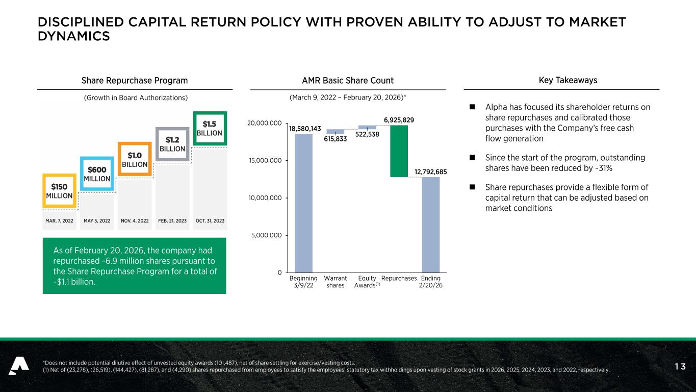 1 3 DISCIPLINED CAPITAL RETURN POLICY WITH PROVEN ABILITY TO ADJUST TO MARKET DYNAMICS 18,580,143 12,792,685 615,833 522,538 6,925,829 0 5,000,000 10,000,000 15,000,000 20,000,000 Beginning 3/9/22 Warrant shares Equity Awards(1) Repurchases Ending 2/20/26 *Does not include potential dilutive effect of unvested equity awards (101,487), net of share settling for exercise/vesting costs. (1) Net of (23,278), (26,519), (144,427), (81,287), and (4,290) shares repurchased from employees to satisfy the employees’ statutory tax withholdings upon vesting of stock grants in 2026, 2025, 2024, 2023, and 2022, respectively.  Alpha has focused its shareholder returns on share repurchases and calibrated those purchases with the Company’s free cash flow generation  Since the start of the program, outstanding shares have been reduced by ~31%  Share repurchases provide a flexible form of capital return that can be adjusted based on market conditions Key TakeawaysAMR Basic Share Count (March 9, 2022 – February 20, 2026)* Share Repurchase Program (Growth in Board Authorizations) As of February 20, 2026, the company had repurchased ~6.9 million shares pursuant to the Share Repurchase Program for a total of ~$1.1 billion.
