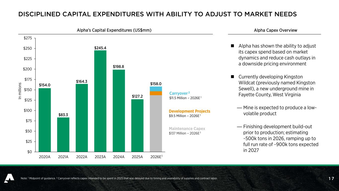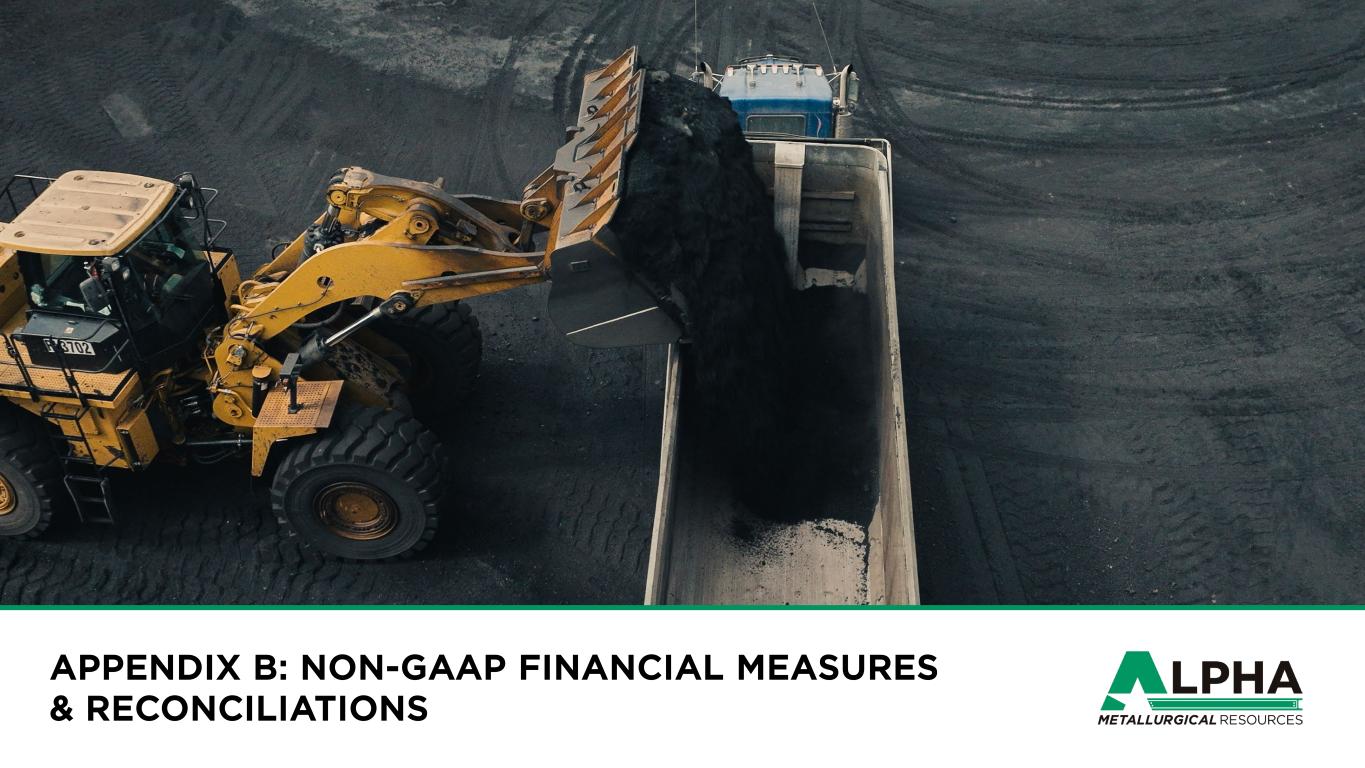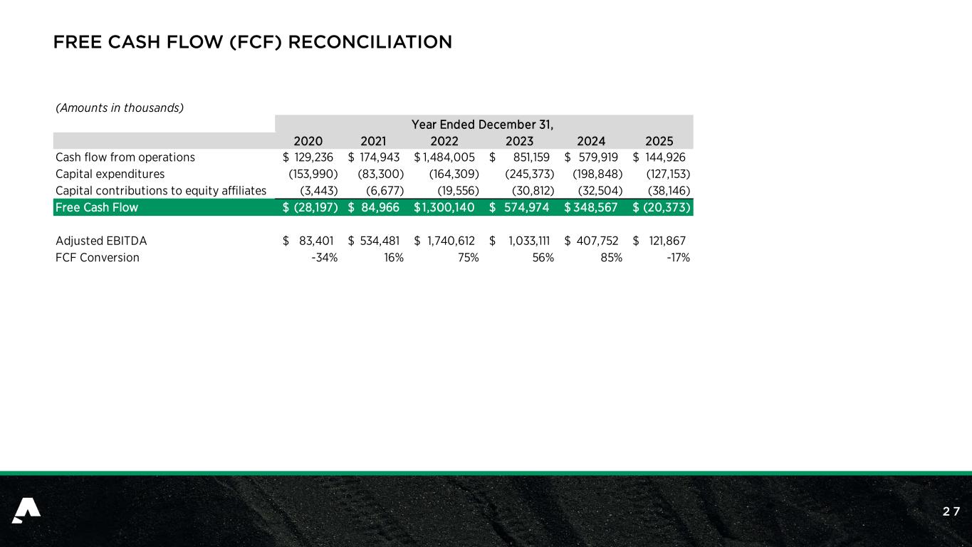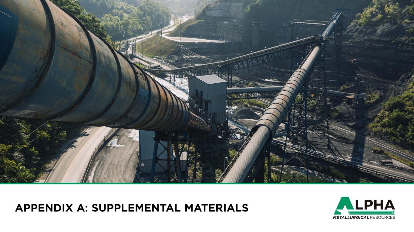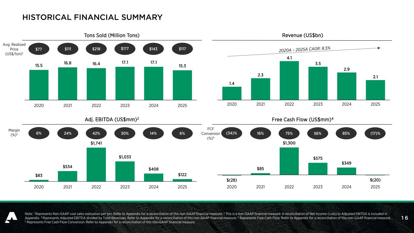 1 6 $(28) $85 $1,300 $575 $349 $(20) 2020 2021 2022 2023 2024 2025 $83 $534 $1,741 $1,033 $408 $122 2020 2021 2022 2023 2024 2025 15.5 16.8 16.4 17.1 17.1 15.3 2020 2021 2022 2023 2024 2025 HISTORICAL FINANCIAL SUMMARY Tons Sold (Million Tons) Revenue (US$bn) Adj. EBITDA (US$mm)2 Free Cash Flow (US$mm)4 Avg. Realized Price (US$/ton)1 Note: 1 Represents Non-GAAP coal sales realization per ton. Refer to Appendix for a reconciliation of this non-GAAP financial measure. 2 This is a non-GAAP financial measure. A reconciliation of Net Income (Loss) to Adjusted EBITDA is included in Appendix. 3 Represents Adjusted EBITDA divided by Total Revenues. Refer to Appendix for a reconciliation of this non-GAAP financial measure. 4 Represents Free Cash Flow. Refer to Appendix for a reconciliation of this non-GAAP financial measure. 5 Represents Free Cash Flow Conversion. Refer to Appendix for a reconciliation of this non-GAAP financial measure. Margin (%)3 FCF Conversion (%)5 1.4 2.3 4.1 3.5 2.9 2.1 2020 2021 2022 2023 2024 2025 $111 $218 $143 $117 6% 24% 42% 30% 14% 6% 75% 56% 85%(34)% 16% $177$77 (17)%