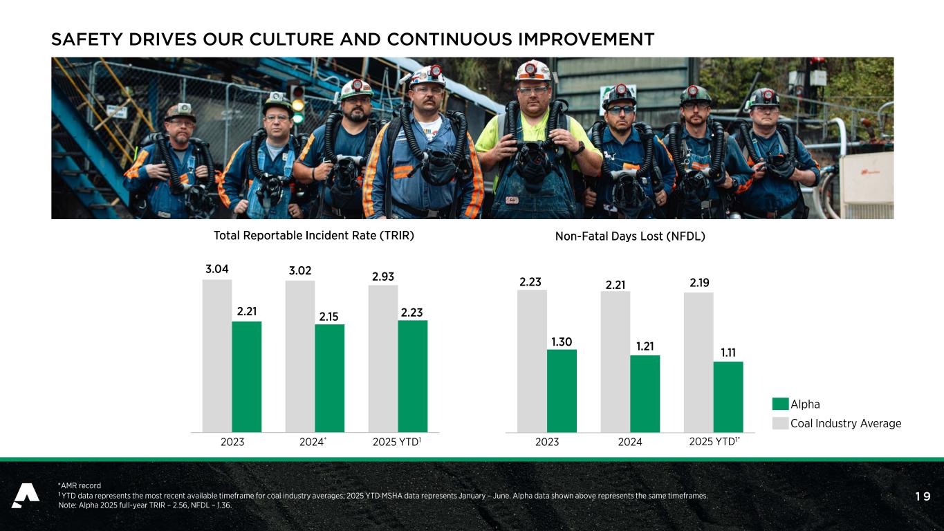 1 9 3.04 3.02 2.93 2.21 2.15 2.23 2023 2024* 2025 YTD1 Coal Industry Average Total Reportable Incident Rate (TRIR) 2.23 2.21 2.19 1.30 1.21 1.11 2023 2024 2025 YTD1* Non-Fatal Days Lost (NFDL) SAFETY DRIVES OUR CULTURE AND CONTINUOUS IMPROVEMENT Alpha 1 YTD data represents the most recent available timeframe for coal industry averages; 2025 YTD MSHA data represents January – June. Alpha data shown above represents the same timeframes. Note: Alpha 2025 full-year TRIR – 2.56, NFDL – 1.36. *AMR record