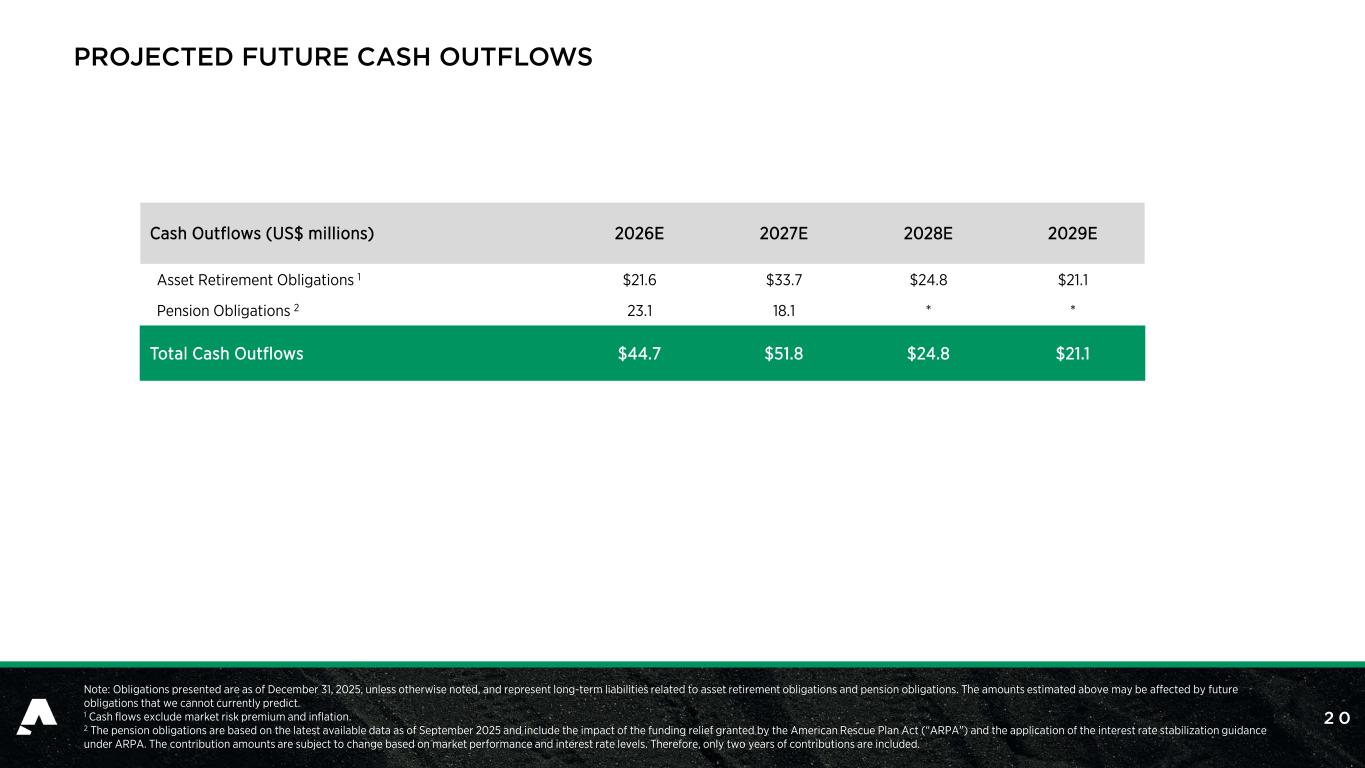 2 0 PROJECTED FUTURE CASH OUTFLOWS Note: Obligations presented are as of December 31, 2025, unless otherwise noted, and represent long-term liabilities related to asset retirement obligations and pension obligations. The amounts estimated above may be affected by future obligations that we cannot currently predict. 1 Cash flows exclude market risk premium and inflation. 2 The pension obligations are based on the latest available data as of September 2025 and include the impact of the funding relief granted by the American Rescue Plan Act (“ARPA”) and the application of the interest rate stabilization guidance under ARPA. The contribution amounts are subject to change based on market performance and interest rate levels. Therefore, only two years of contributions are included. Cash Outflows (US$ millions) 2026E 2027E 2028E 2029E Asset Retirement Obligations 1 $21.6 $33.7 $24.8 $21.1 Pension Obligations 2 23.1 18.1 * * Total Cash Outflows $44.7 $51.8 $24.8 $21.1