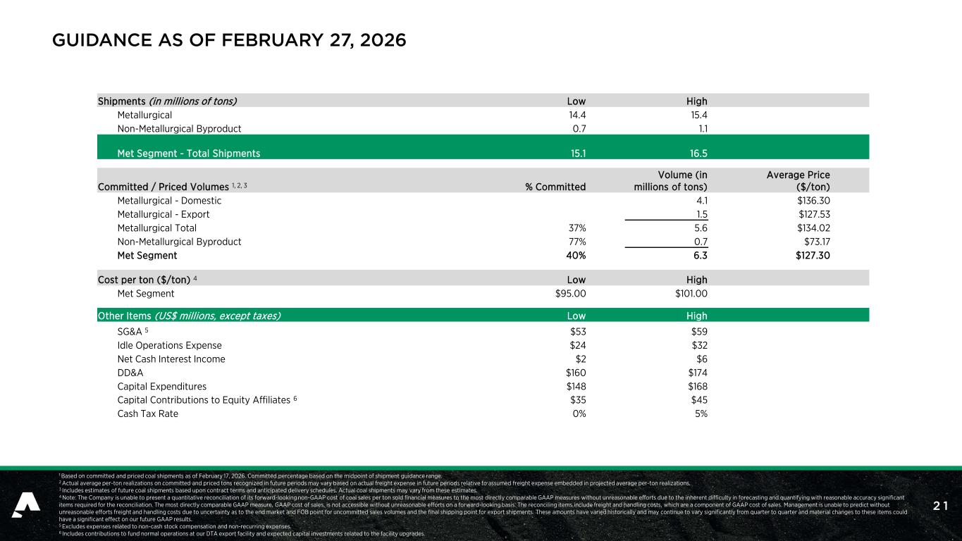 2 1 1 Based on committed and priced coal shipments as of February 17, 2026. Committed percentage based on the midpoint of shipment guidance range. 2 Actual average per-ton realizations on committed and priced tons recognized in future periods may vary based on actual freight expense in future periods relative to assumed freight expense embedded in projected average per-ton realizations. 3 Includes estimates of future coal shipments based upon contract terms and anticipated delivery schedules. Actual coal shipments may vary from these estimates. 4 Note: The Company is unable to present a quantitative reconciliation of its forward-looking non-GAAP cost of coal sales per ton sold financial measures to the most directly comparable GAAP measures without unreasonable efforts due to the inherent difficulty in forecasting and quantifying with reasonable accuracy significant items required for the reconciliation. The most directly comparable GAAP measure, GAAP cost of sales, is not accessible without unreasonable efforts on a forward-looking basis. The reconciling items include freight and handling costs, which are a component of GAAP cost of sales. Management is unable to predict without unreasonable efforts freight and handling costs due to uncertainty as to the end market and FOB point for uncommitted sales volumes and the final shipping point for export shipments. These amounts have varied historically and may continue to vary significantly from quarter to quarter and material changes to these items could have a significant effect on our future GAAP results. 5 Excludes expenses related to non-cash stock compensation and non-recurring expenses. 6 Includes contributions to fund normal operations at our DTA export facility and expected capital investments related to the facility upgrades. GUIDANCE AS OF FEBRUARY 27, 2026 Shipments (in millions of tons) Low High Metallurgical 14.4 15.4 Non-Metallurgical Byproduct 0.7 1.1 Met Segment - Total Shipments 15.1 16.5 Committed / Priced Volumes 1, 2, 3 % Committed Volume (in millions of tons) Average Price ($/ton) Metallurgical - Domestic 4.1 $136.30 Metallurgical - Export 1.5 $127.53 Metallurgical Total 37% 5.6 $134.02 Non-Metallurgical Byproduct 77% 0.7 $73.17 Met Segment 40% 6.3 $127.30 Cost per ton ($/ton) 4 Low High Met Segment $95.00 $101.00 Other Items (US$ millions, except taxes) Low High SG&A 5 $53 $59 Idle Operations Expense $24 $32 Net Cash Interest Income $2 $6 DD&A $160 $174 Capital Expenditures $148 $168 Capital Contributions to Equity Affiliates 6 $35 $45 Cash Tax Rate 0% 5%