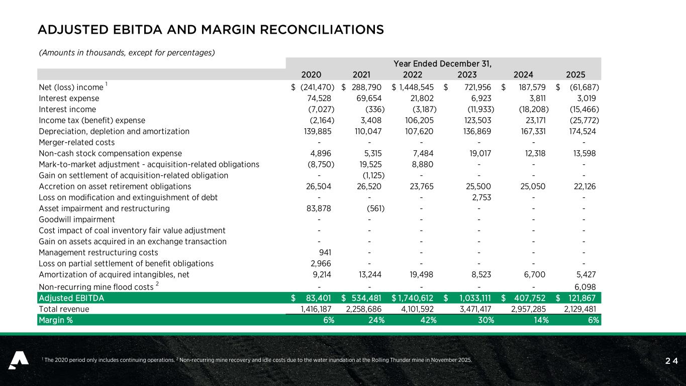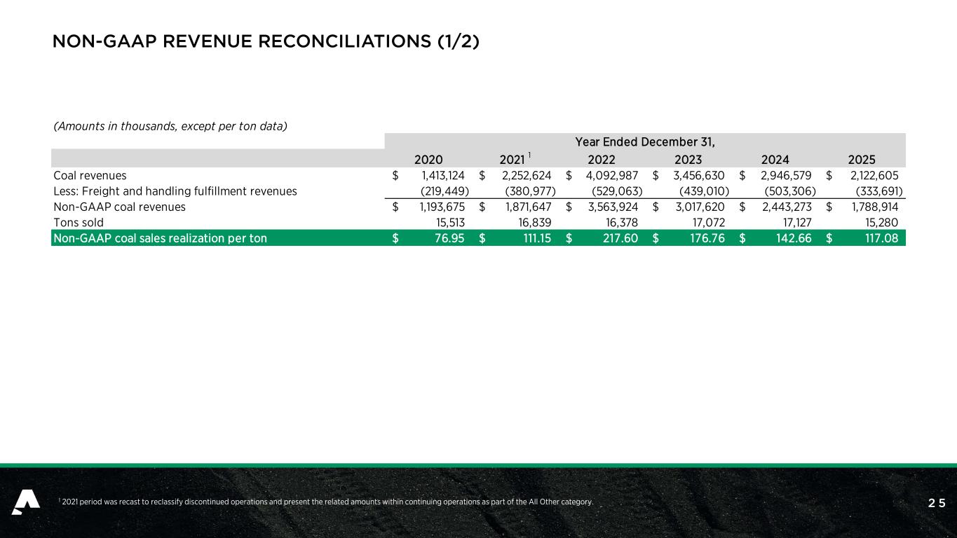 2 4 ADJUSTED EBITDA AND MARGIN RECONCILIATIONS 1 The 2020 period only includes continuing operations. 2 Non-recurring mine recovery and idle costs due to the water inundation at the Rolling Thunder mine in November 2025. (Amounts in thousands, except for percentages) 2020 2021 2022 2023 2024 2025 Net (loss) income 1 (241,470)$ 288,790$ 1,448,545$ 721,956$ 187,579$ (61,687)$ Interest expense 74,528 69,654 21,802 6,923 3,811 3,019 Interest income (7,027) (336) (3,187) (11,933) (18,208) (15,466) Income tax (benefit) expense (2,164) 3,408 106,205 123,503 23,171 (25,772) Depreciation, depletion and amortization 139,885 110,047 107,620 136,869 167,331 174,524 Merger-related costs - - - - - - Non-cash stock compensation expense 4,896 5,315 7,484 19,017 12,318 13,598 Mark-to-market adjustment - acquisition-related obligations (8,750) 19,525 8,880 - - - Gain on settlement of acquisition-related obligation - (1,125) - - - - Accretion on asset retirement obligations 26,504 26,520 23,765 25,500 25,050 22,126 Loss on modification and extinguishment of debt - - - 2,753 - - Asset impairment and restructuring 83,878 (561) - - - - Goodwill impairment - - - - - - Cost impact of coal inventory fair value adjustment - - - - - - Gain on assets acquired in an exchange transaction - - - - - - Management restructuring costs 941 - - - - - Loss on partial settlement of benefit obligations 2,966 - - - - - Amortization of acquired intangibles, net 9,214 13,244 19,498 8,523 6,700 5,427 Non-recurring mine flood costs 2 - - - - - 6,098 Adjusted EBITDA 83,401$ 534,481$ 1,740,612$ 1,033,111$ 407,752$ 121,867$ Total revenue 1,416,187 2,258,686 4,101,592 3,471,417 2,957,285 2,129,481 Margin % 6% 24% 42% 30% 14% 6% Year Ended December 31,