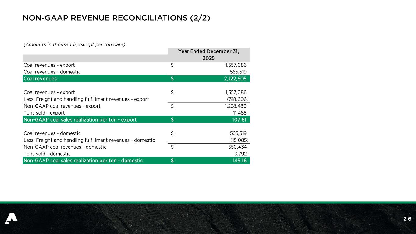 2 5 NON-GAAP REVENUE RECONCILIATIONS (1/2) 1 2021 period was recast to reclassify discontinued operations and present the related amounts within continuing operations as part of the All Other category. (Amounts in thousands, except per ton data) 2020 2021 1 2022 2023 2024 2025 Coal revenues 1,413,124$ 2,252,624$ 4,092,987$ 3,456,630$ 2,946,579$ 2,122,605$ Less: Freight and handling fulfillment revenues (219,449) (380,977) (529,063) (439,010) (503,306) (333,691) Non-GAAP coal revenues 1,193,675$ 1,871,647$ 3,563,924$ 3,017,620$ 2,443,273$ 1,788,914$ Tons sold 15,513 16,839 16,378 17,072 17,127 15,280 Non-GAAP coal sales realization per ton 76.95$ 111.15$ 217.60$ 176.76$ 142.66$ 117.08$ Year Ended December 31,