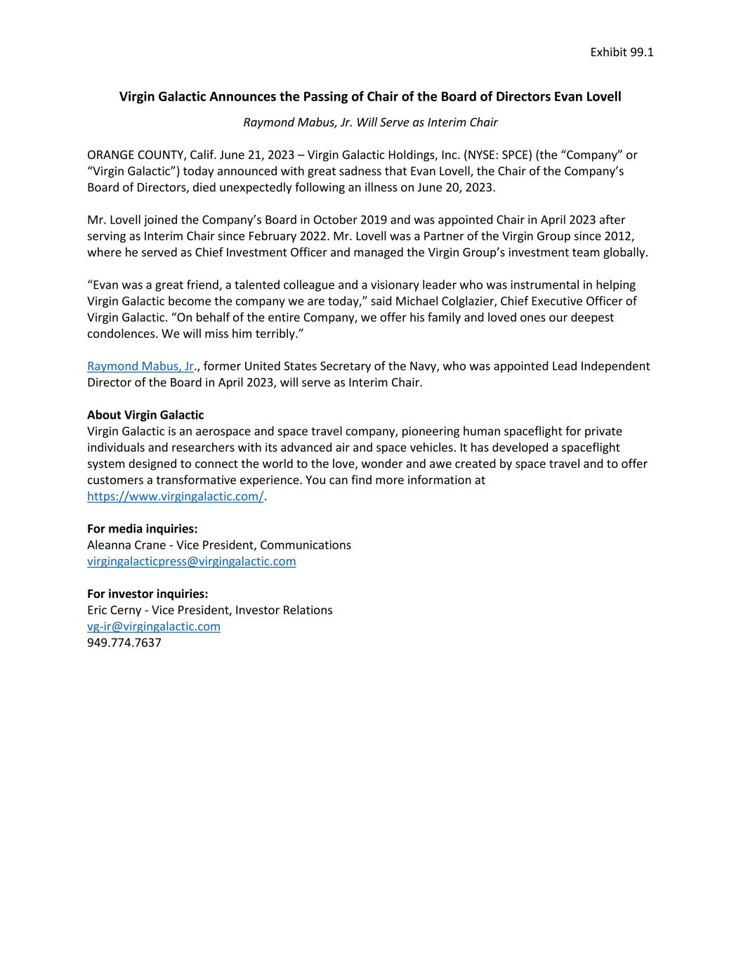 Exhibit 99.1 Virgin Galactic Announces the Passing of Chair of the Board of Directors Evan Lovell Raymond Mabus, Jr. Will Serve as Interim Chair ORANGE COUNTY, Calif. June 21, 2023 – Virgin Galactic Holdings, Inc. (NYSE: SPCE) (the “Company” or “Virgin Galactic”) today announced with great sadness that Evan Lovell, the Chair of the Company’s Board of Directors, died unexpectedly following an illness on June 20, 2023. Mr. Lovell joined the Company’s Board in October 2019 and was appointed Chair in April 2023 after serving as Interim Chair since February 2022. Mr. Lovell was a Partner of the Virgin Group since 2012, where he served as Chief Investment Officer and managed the Virgin Group’s investment team globally. “Evan was a great friend, a talented colleague and a visionary leader who was instrumental in helping Virgin Galactic become the company we are today,” said Michael Colglazier, Chief Executive Officer of Virgin Galactic. “On behalf of the entire Company, we offer his family and loved ones our deepest condolences. We will miss him terribly.” Raymond Mabus, Jr., former United States Secretary of the Navy, who was appointed Lead Independent Director of the Board in April 2023, will serve as Interim Chair. About Virgin Galactic Virgin Galactic is an aerospace and space travel company, pioneering human spaceflight for private individuals and researchers with its advanced air and space vehicles. It has developed a spaceflight system designed to connect the world to the love, wonder and awe created by space travel and to offer customers a transformative experience. You can find more information at https://www.virgingalactic.com/. For media inquiries: Aleanna Crane - Vice President, Communications virgingalacticpress@virgingalactic.com For investor inquiries: Eric Cerny - Vice President, Investor Relations vg-ir@virgingalactic.com 949.774.7637