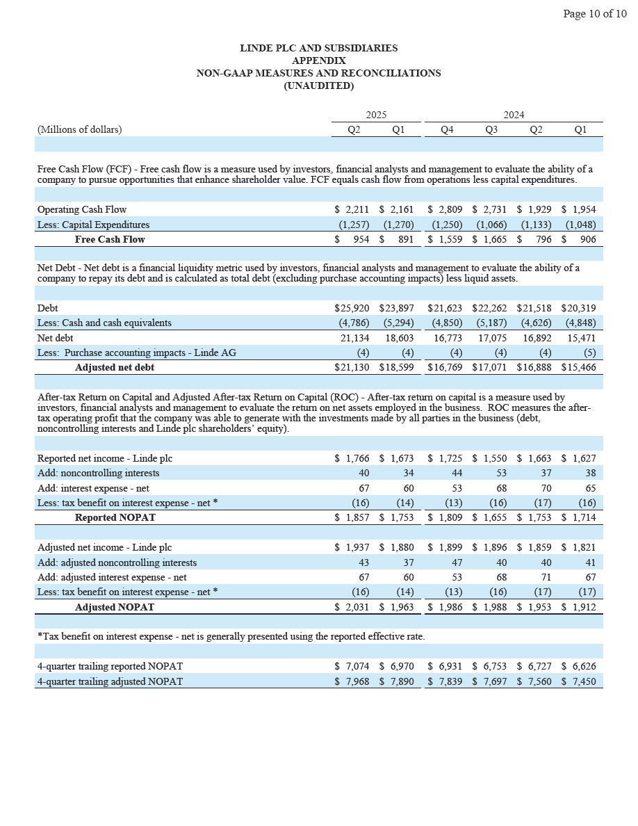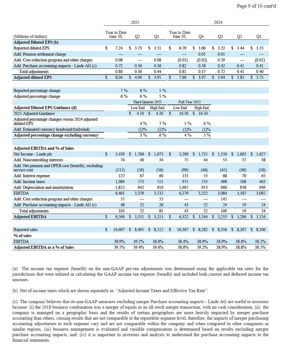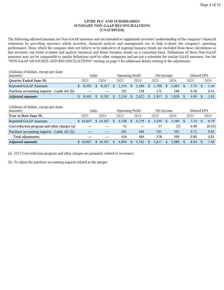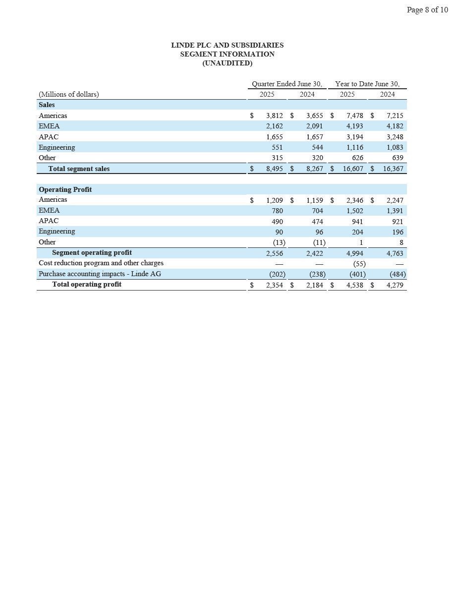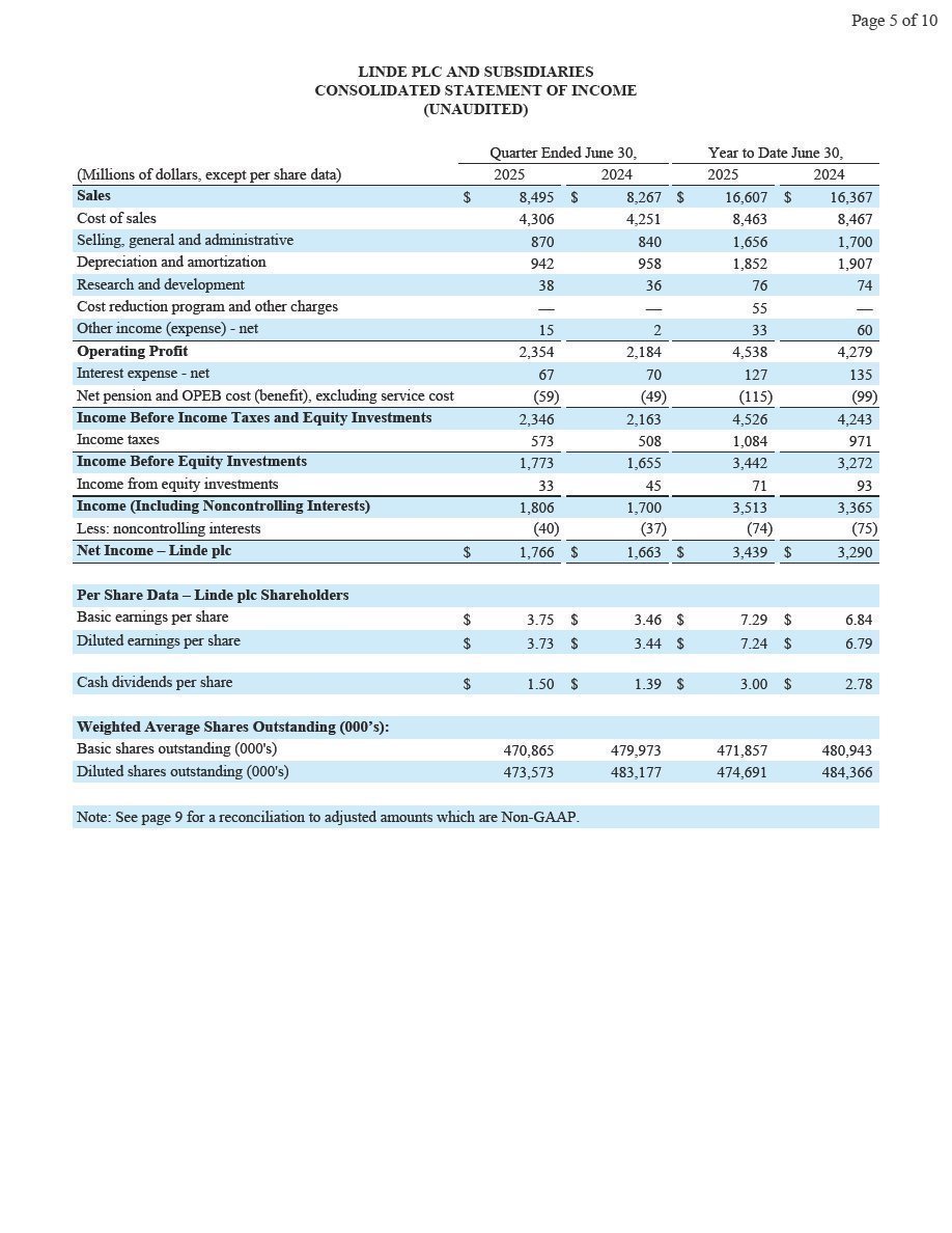 Woking, UK, August 1, 2025 – Linde plc (Nasdaq: LIN) today reported second-quarter 2025 net income of $1,766 million and diluted earnings per share of $3.73, up 6% and up 8%, respectively. Excluding Linde AG purchase accounting impacts, adjusted net income was $1,937 million, up 4% versus prior year. Adjusted earnings per share was $4.09, 6% above prior year.