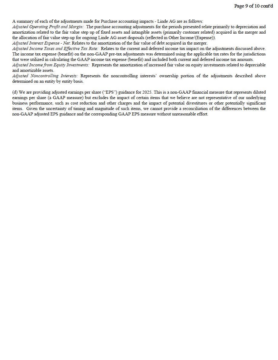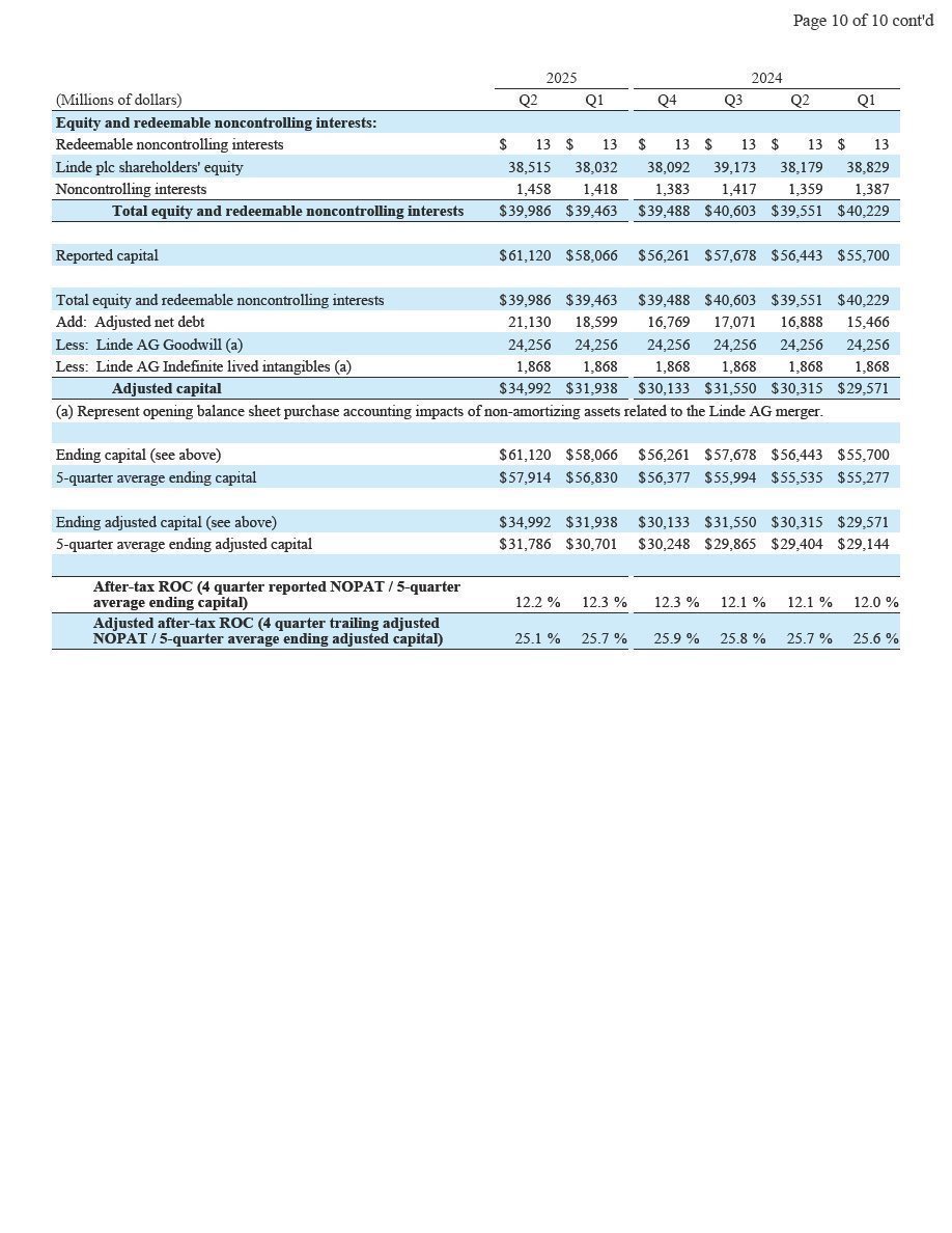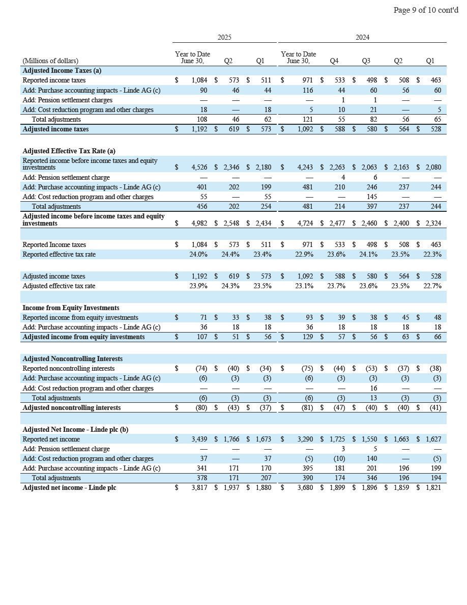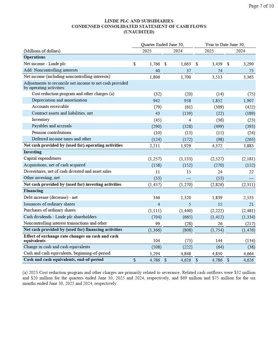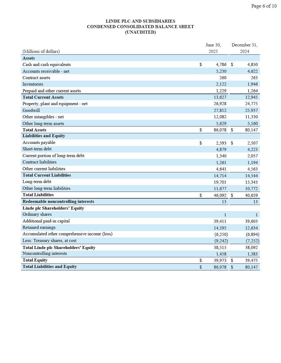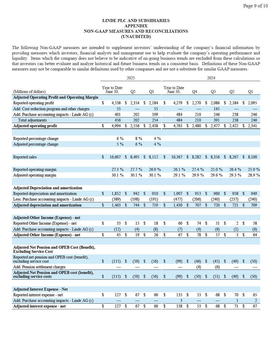 Woking, UK, August 1, 2025 – Linde plc (Nasdaq: LIN) today reported second-quarter 2025 net income of $1,766 million and diluted earnings per share of $3.73, up 6% and up 8%, respectively. Excluding Linde AG purchase accounting impacts, adjusted net income was $1,937 million, up 4% versus prior year. Adjusted earnings per share was $4.09, 6% above prior year.