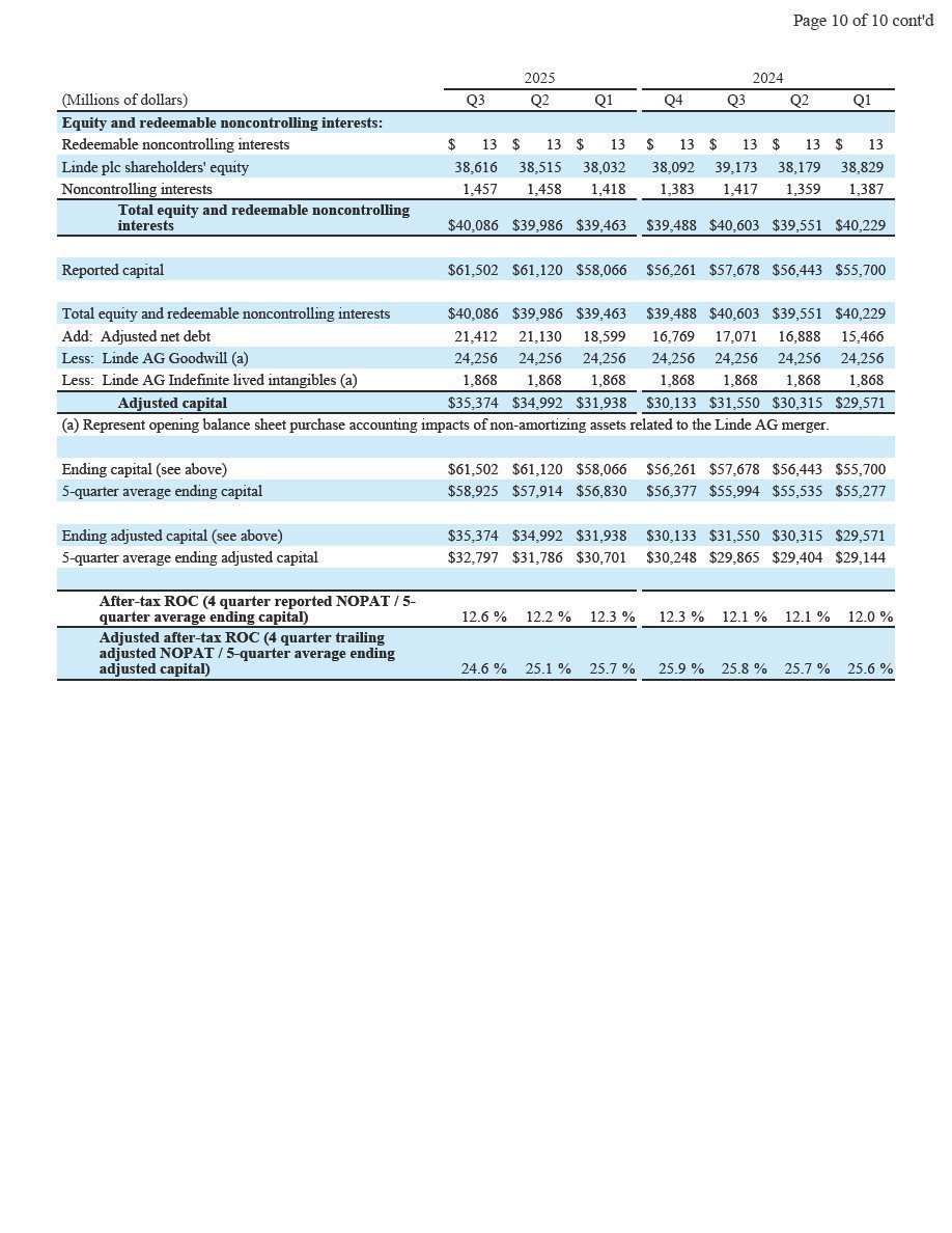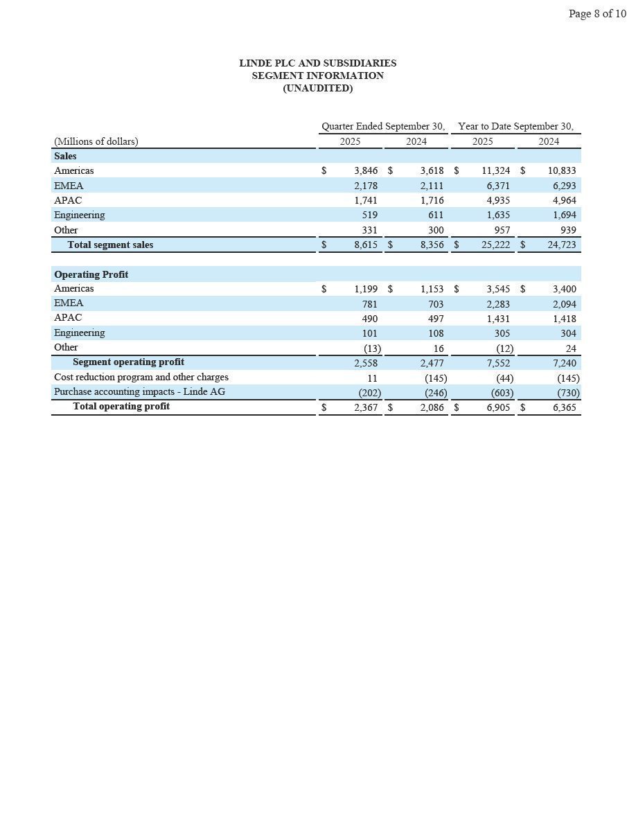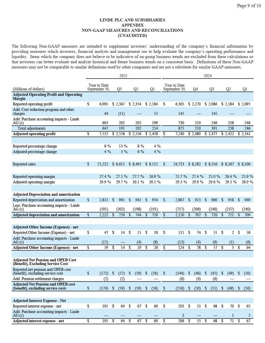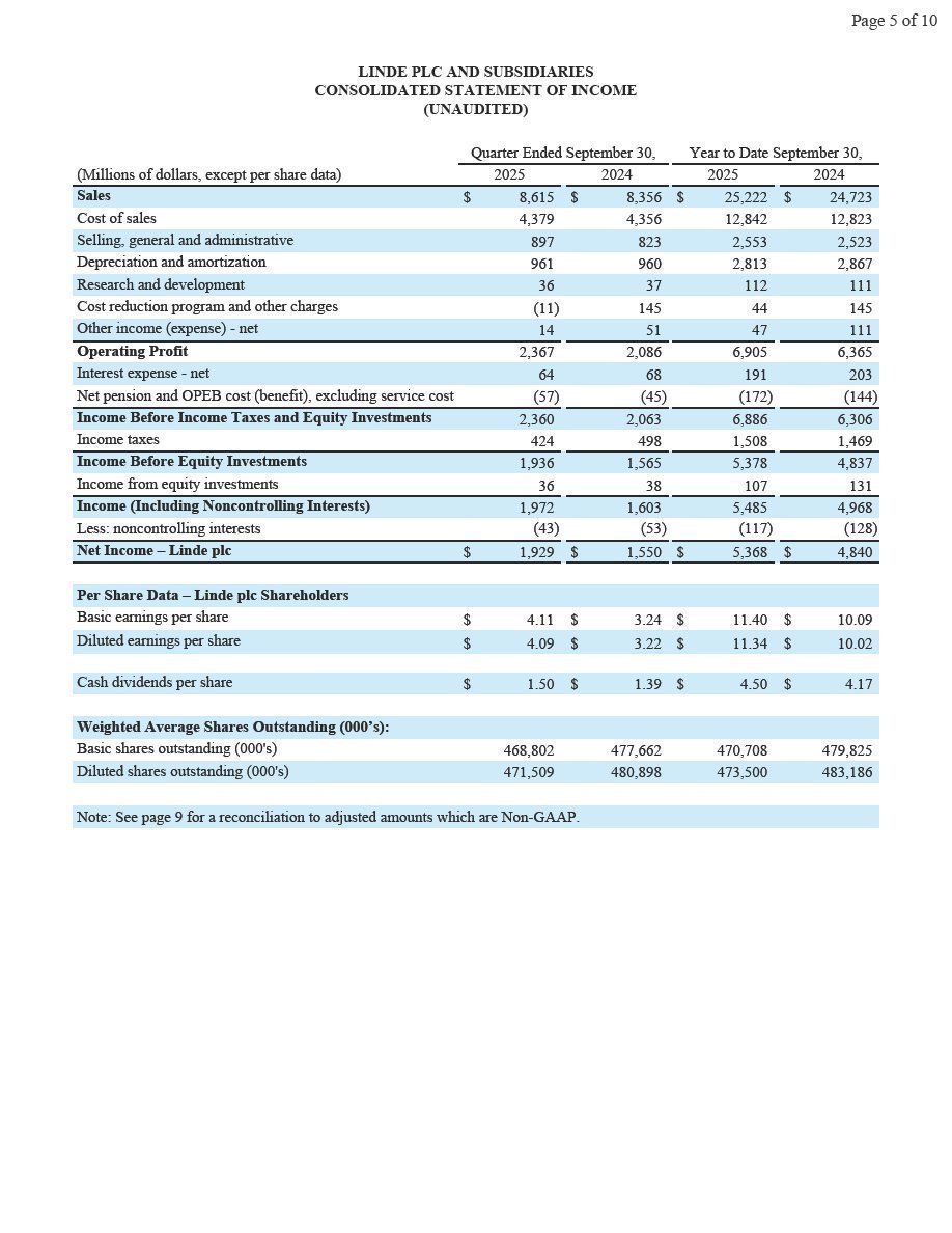 Woking, UK, October 31, 2025 – Linde plc (Nasdaq: LIN) today reported third-quarter 2025 net income of $1,929 million and diluted earnings per share of $4.09, up 24% and up 27%, respectively.  Excluding Linde AG purchase accounting impacts and cost reduction program and other charges, adjusted net income was $1,987 million, up 5% versus prior year.  Adjusted earnings per share was $4.21, 7% above prior year.