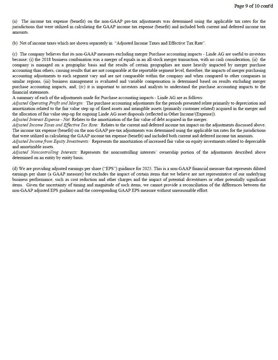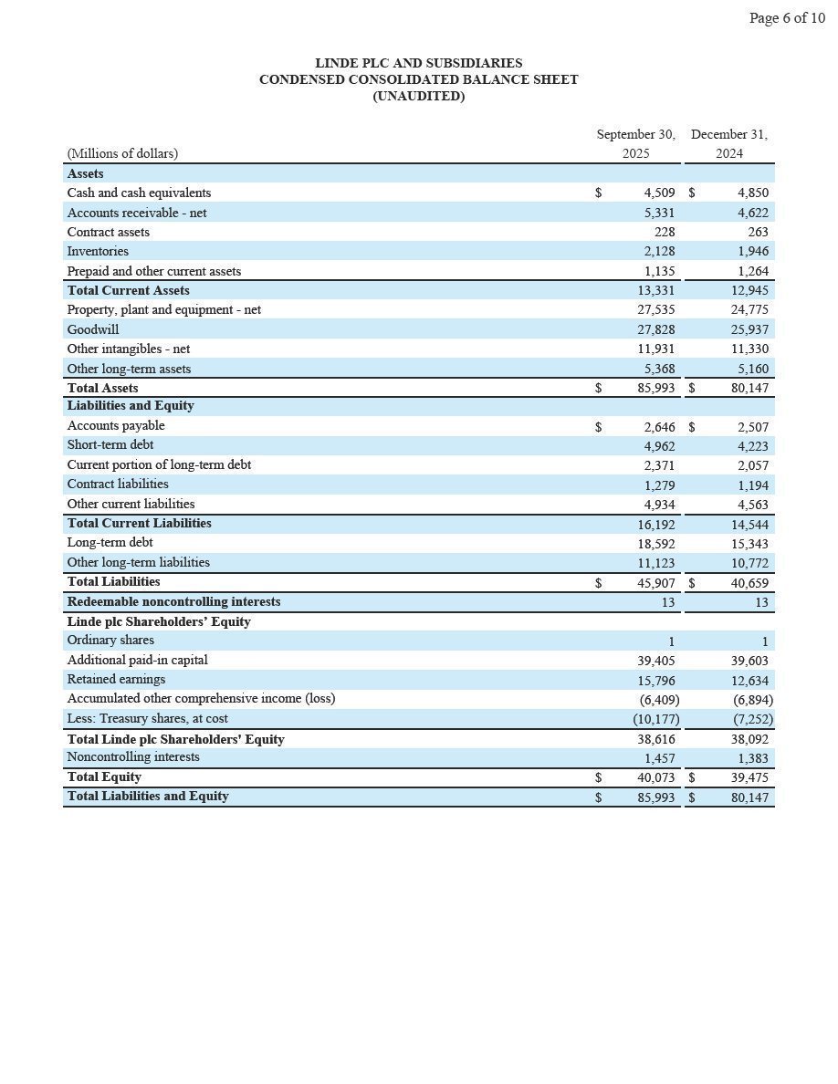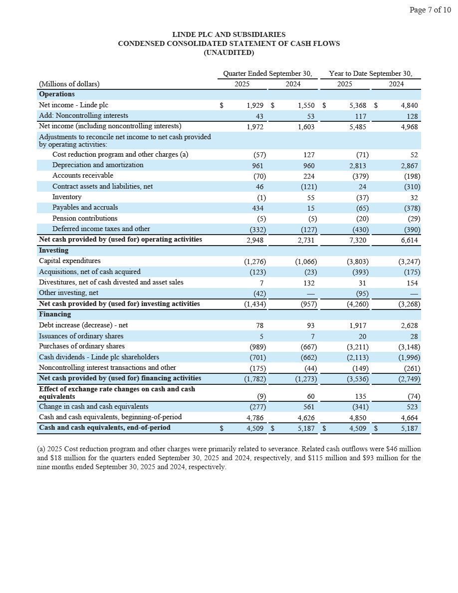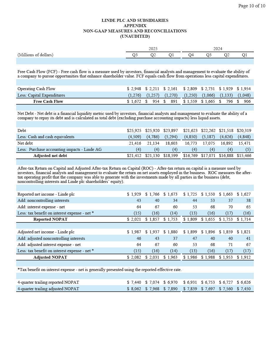Woking, UK, October 31, 2025 – Linde plc (Nasdaq: LIN) today reported third-quarter 2025 net income of $1,929 million and diluted earnings per share of $4.09, up 24% and up 27%, respectively.  Excluding Linde AG purchase accounting impacts and cost reduction program and other charges, adjusted net income was $1,987 million, up 5% versus prior year.  Adjusted earnings per share was $4.21, 7% above prior year.