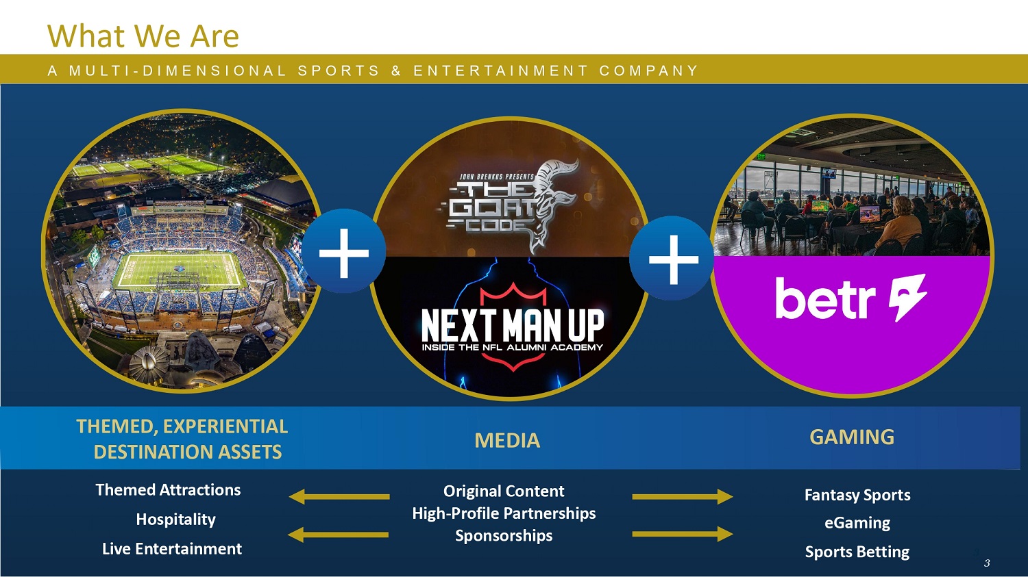 Who We Are W H A T W E D O As a world - class resort and sports entertainment company, we do what no other company can through our unique brand partnerships and direct access to exclusive content. By doing this, we create exceptional experiences across multiple platforms that honor the past and inspire the future. With this unwavering purpose, we strive to maximize shareholder value and pursue excellence. Honor the Past, Inspire the Future 2