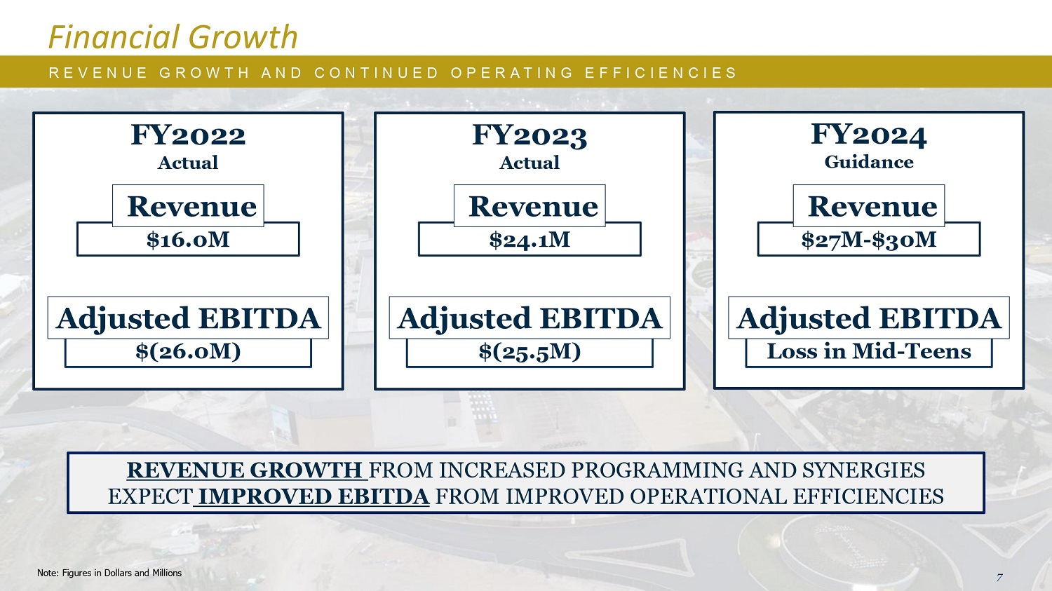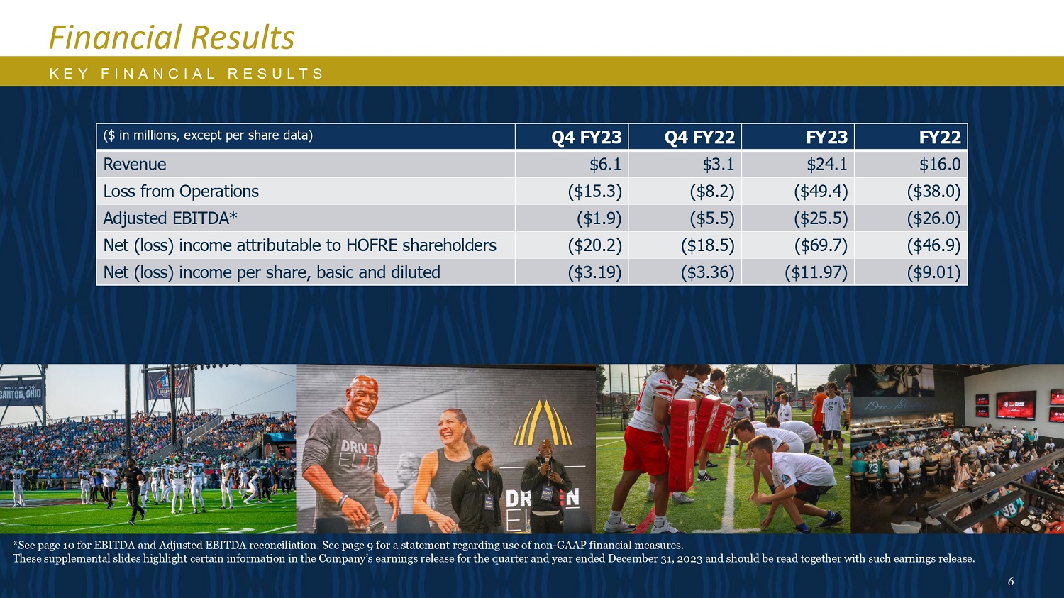Financial Results K E Y F I N A N C I A L R E S U L T S FY22 FY23 Q4 FY22 Q4 FY23 ($ in millions, except per share data) $16.0 $24.1 $3.1 $6.1 Revenue ($38.0) ($49.4) ($8.2) ($15.3) Loss from Operations ($26.0) ($25.5) ($5.5) ($1.9) Adjusted EBITDA* ($46.9) ($69.7) ($18.5) ($20.2) Net (loss) income attributable to HOFRE shareholders ($9.01) ($11.97) ($3.36) ($3.19) Net (loss) income per share, basic and diluted *See page 10 for EBITDA and Adjusted EBITDA reconciliation. See page 9 for a statement regarding use of non - GAAP financial measures. These supplemental slides highlight certain information in the Company’s earnings release for the quarter and year ended December 31, 2023 and should be read together with such earnings release. 6