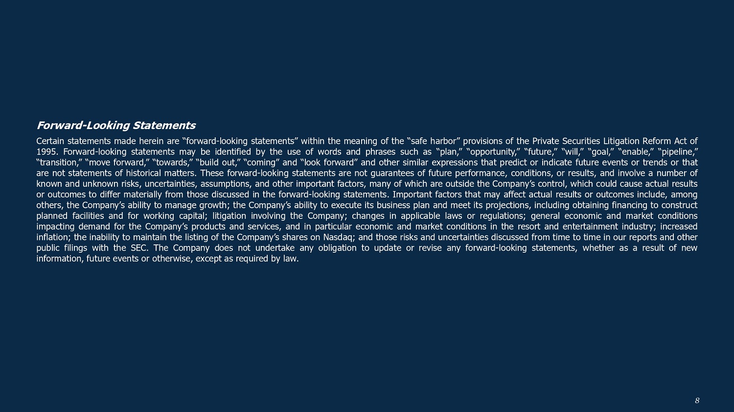Forward - Looking Statements Certain statements made herein are “forward - looking statements” within the meaning of the “safe harbor” provisions of the Private Securities Litigation Reform Act of 1995 . Forward - looking statements may be identified by the use of words and phrases such as “plan,” “opportunity,” “future,” “will,” “goal,” “enable,” “pipeline,” “transition,” “move forward,” “towards,” “build out,” “coming” and “look forward” and other similar expressions that predict or indicate future events or trends or that are not statements of historical matters . These forward - looking statements are not guarantees of future performance, conditions, or results, and involve a number of known and unknown risks, uncertainties, assumptions, and other important factors, many of which are outside the Company’s control, which could cause actual results or outcomes to differ materially from those discussed in the forward - looking statements . Important factors that may affect actual results or outcomes include, among others, the Company’s ability to manage growth ; the Company’s ability to execute its business plan and meet its projections, including obtaining financing to construct planned facilities and for working capital ; litigation involving the Company ; changes in applicable laws or regulations ; general economic and market conditions impacting demand for the Company’s products and services, and in particular economic and market conditions in the resort and entertainment industry ; increased inflation ; the inability to maintain the listing of the Company’s shares on Nasdaq ; and those risks and uncertainties discussed from time to time in our reports and other public filings with the SEC . The Company does not undertake any obligation to update or revise any forward - looking statements, whether as a result of new information, future events or otherwise, except as required by law . 8