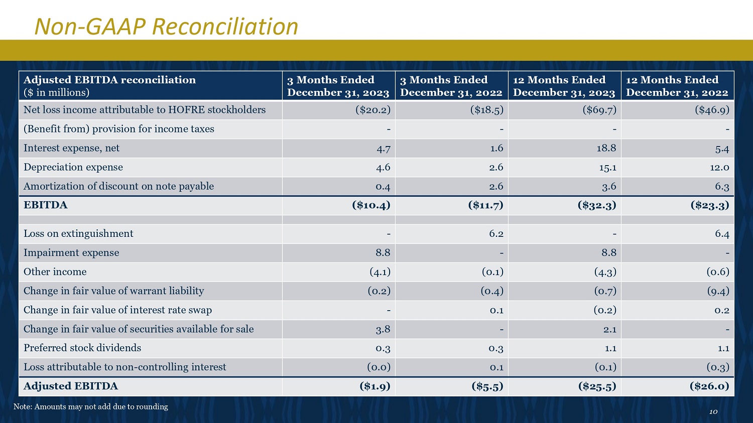 Non - GAAP Reconciliation Note: Amounts may not add due to rounding 10 12 Months Ended December 31, 2022 12 Months Ended December 31, 2023 3 Months Ended December 31, 2022 3 Months Ended December 31, 2023 Adjusted EBITDA reconciliation ($ in millions) ($46.9) ($69.7) ($18.5) ($20.2) Net loss income attributable to HOFRE stockholders - - - - (Benefit from) provision for income taxes 5.4 18.8 1.6 4.7 Interest expense, net 12.0 15.1 2.6 4.6 Depreciation expense 6.3 3.6 2.6 0.4 Amortization of discount on note payable ($23.3) ($32.3) ($11.7) ($10.4) EBITDA 6.4 - 6.2 - Loss on extinguishment - 8.8 - 8.8 Impairment expense (0.6) (4.3) (0.1) (4.1) Other income (9.4) (0.7) (0.4) (0.2) Change in fair value of warrant liability 0.2 (0.2) 0.1 - Change in fair value of interest rate swap - 2.1 - 3.8 Change in fair value of securities available for sale 1.1 1.1 0.3 0.3 Preferred stock dividends (0.3) (0.1) 0.1 (0.0) Loss attributable to non - controlling interest ($26.0) ($25.5) ($5.5) ($1.9) Adjusted EBITDA