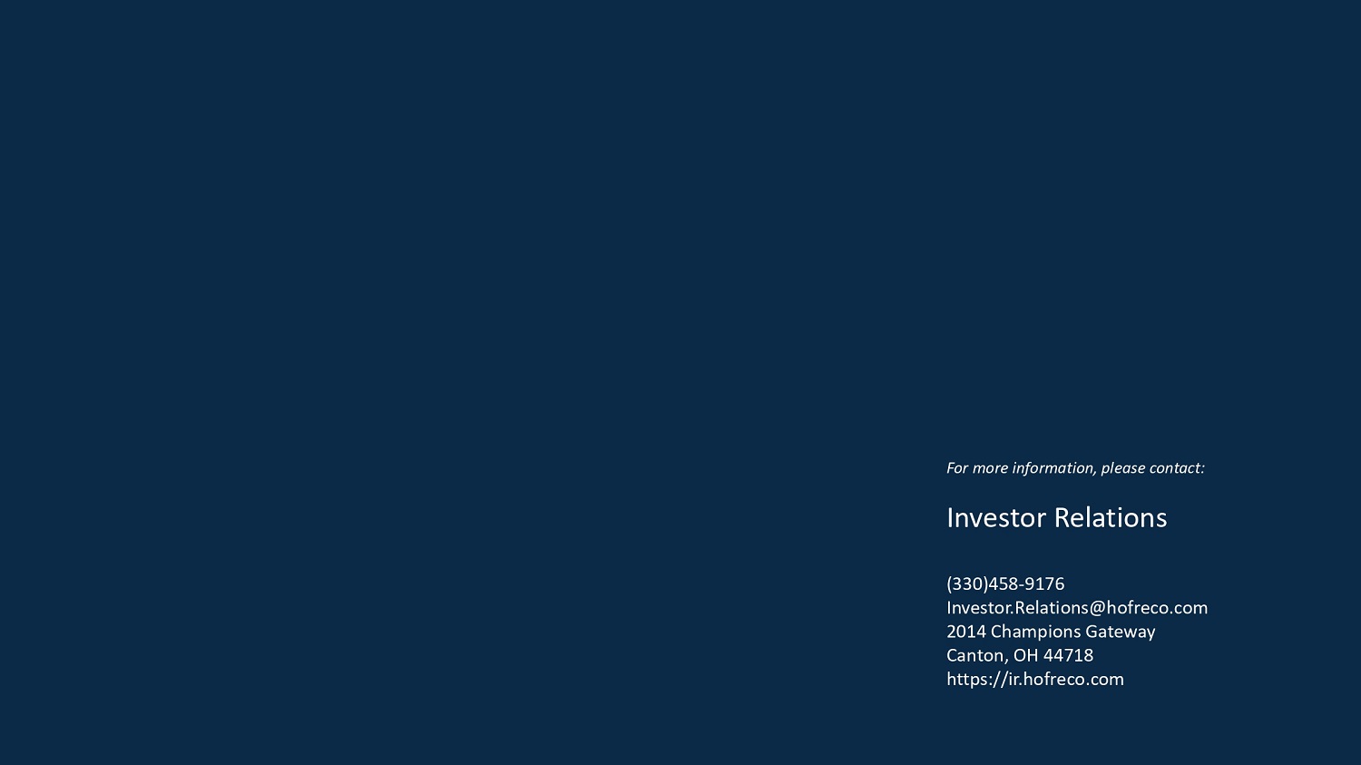 For more information, please contact: Investor Relations (330)458 - 9176 I n v e s t o r . R el a tio n s@ h o f r e c o. c om 2014 Champions Gateway Canton, OH 44718 https://ir.hofreco.com