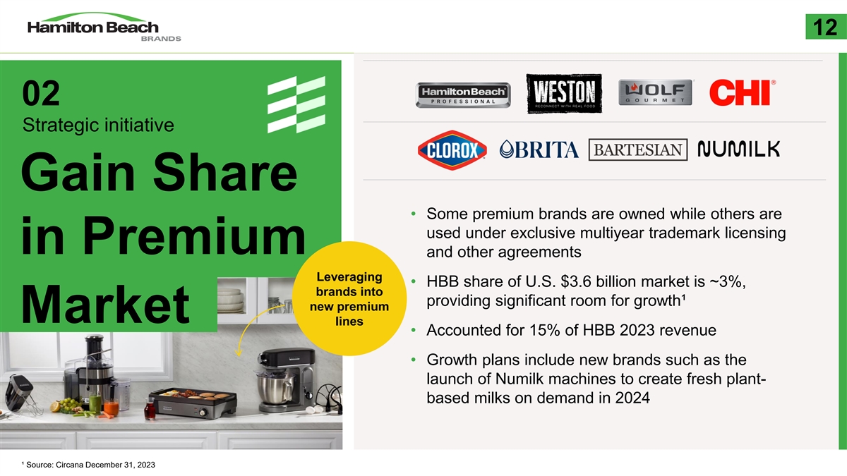 12 02 Strategic initiative Gain Share • Some premium brands are owned while others are used under exclusive multiyear trademark licensing in Premium and other agreements Leveraging • HBB share of U.S. $3.6 billion market is ~3%, brands into providing significant room for growth¹ new premium Market lines • Accounted for 15% of HBB 2023 revenue • Growth plans include new brands such as the launch of Numilk machines to create fresh plant- based milks on demand in 2024 ¹ Source: Circana December 31, 2023