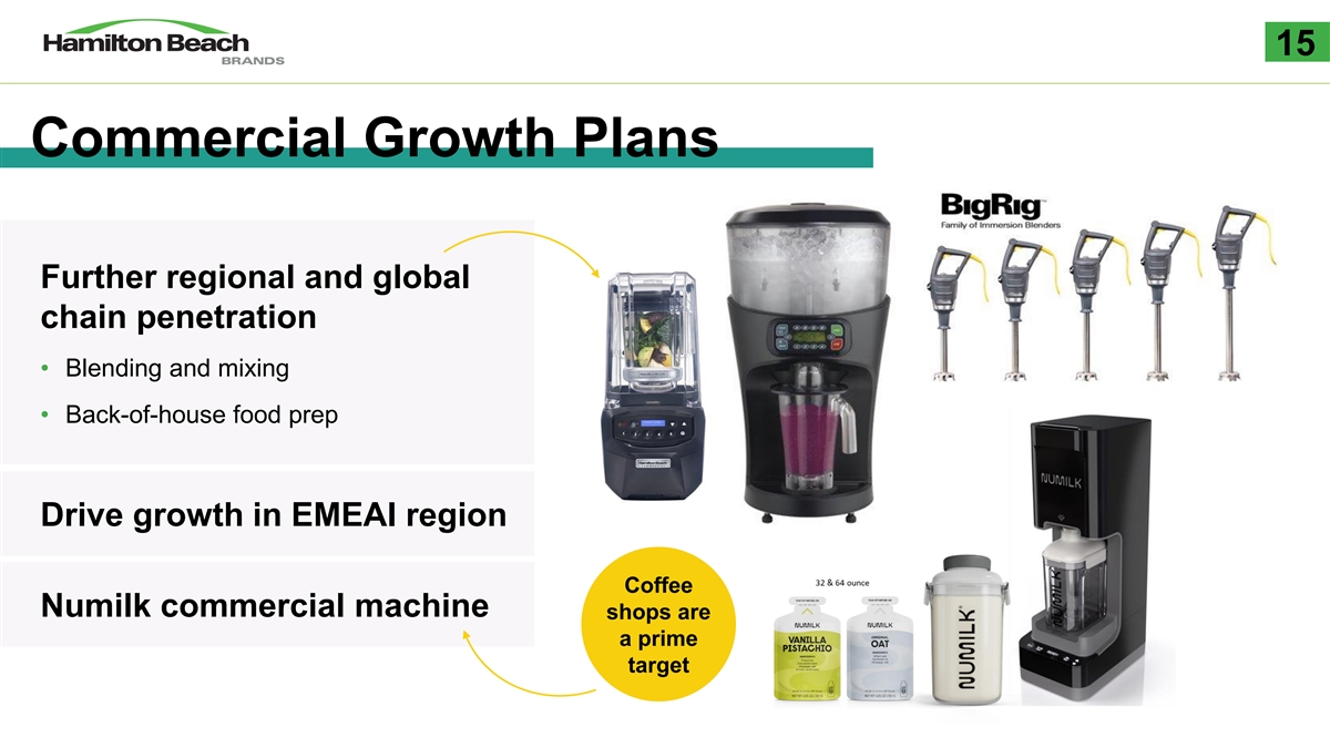 14 03 Strategic initiative • Increasing participation in multi-billion-dollar Lead in Global global market with significant upside • Investing in higher margin products for commercial food service/beverages and Commercial hotel amenities • Accounted for 8% of HBB 2023 revenue Market • Growth plans include product innovations, increasing sales with existing/new customers, and leveraging HBB partnerships