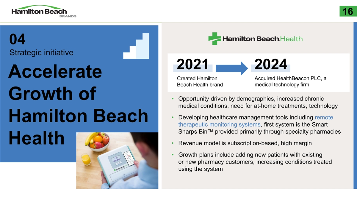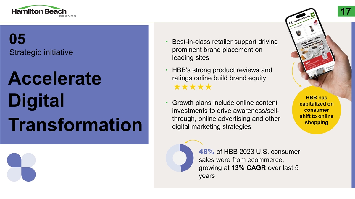 16 04 Strategic initiative 2021 2024 Accelerate Acquired HealthBeacon PLC, a Created Hamilton Beach Health brand medical technology firm Growth of • Opportunity driven by demographics, increased chronic medical conditions, need for at-home treatments, technology • Developing healthcare management tools including remote Hamilton Beach therapeutic monitoring systems, first system is the Smart Sharps Bin provided primarily through specialty pharmacies Health • Revenue model is subscription-based, high margin • Growth plans include adding new patients with existing or new pharmacy customers, increasing conditions treated using the system