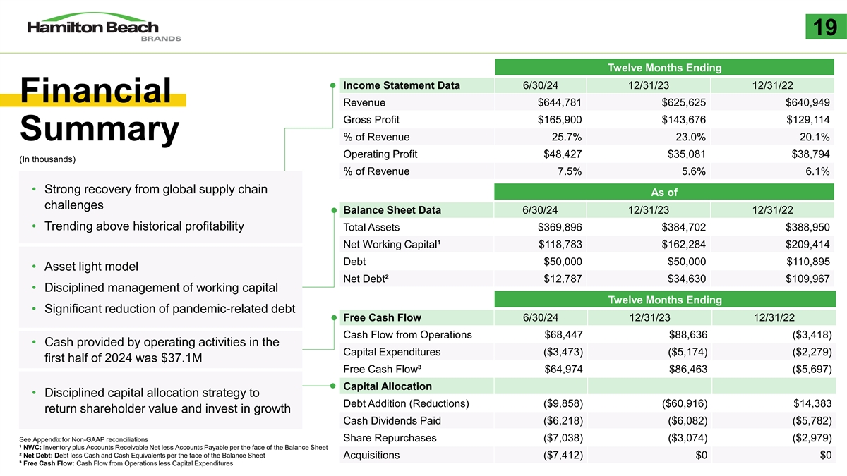 19 Twelve Months Ending Income Statement Data 6/30/24 12/31/23 12/31/22 Financial Revenue $644,781 $625,625 $640,949 Gross Profit $165,900 $143,676 $129,114 Summary % of Revenue 25.7% 23.0% 20.1% Operating Profit $48,427 $35,081 $38,794 (In thousands) % of Revenue 7.5% 5.6% 6.1% • Strong recovery from global supply chain As of challenges Balance Sheet Data 6/30/24 12/31/23 12/31/22 • Trending above historical profitability Total Assets $369,896 $384,702 $388,950 Net Working Capital¹ $118,783 $162,284 $209,414 Debt $50,000 $50,000 $110,895 • Asset light model Net Debt² $12,787 $34,630 $109,967 • Disciplined management of working capital Twelve Months Ending • Significant reduction of pandemic-related debt Free Cash Flow 6/30/24 12/31/23 12/31/22 Cash Flow from Operations $68,447 $88,636 ($3,418) • Cash provided by operating activities in the Capital Expenditures ($3,473) ($5,174) ($2,279) first half of 2024 was $37.1M Free Cash Flow³ $64,974 $86,463 ($5,697) Capital Allocation • Disciplined capital allocation strategy to Debt Addition (Reductions) ($9,858) ($60,916) $14,383 return shareholder value and invest in growth Cash Dividends Paid ($6,218) ($6,082) ($5,782) See Appendix for Non-GAAP reconciliations Share Repurchases ($7,038) ($3,074) ($2,979) ¹ NWC: Inventory plus Accounts Receivable Net less Accounts Payable per the face of the Balance Sheet ² Net Debt: Debt less Cash and Cash Equivalents per the face of the Balance Sheet Acquisitions ($7,412) $0 $0 ³ Free Cash Flow: Cash Flow from Operations less Capital Expenditures