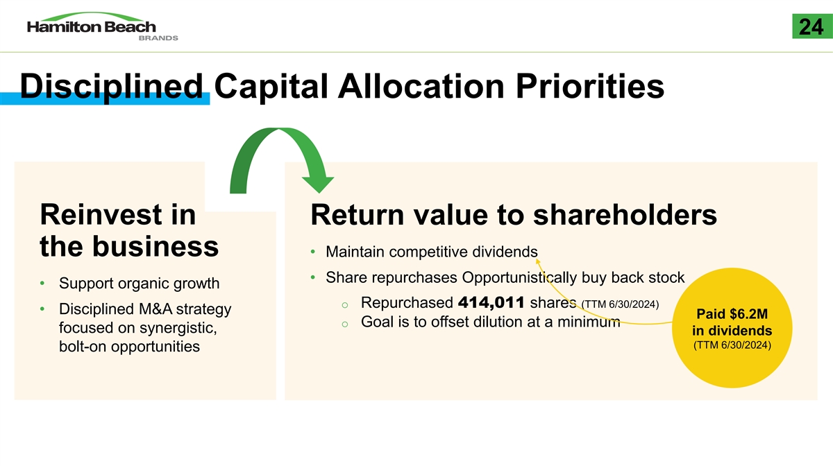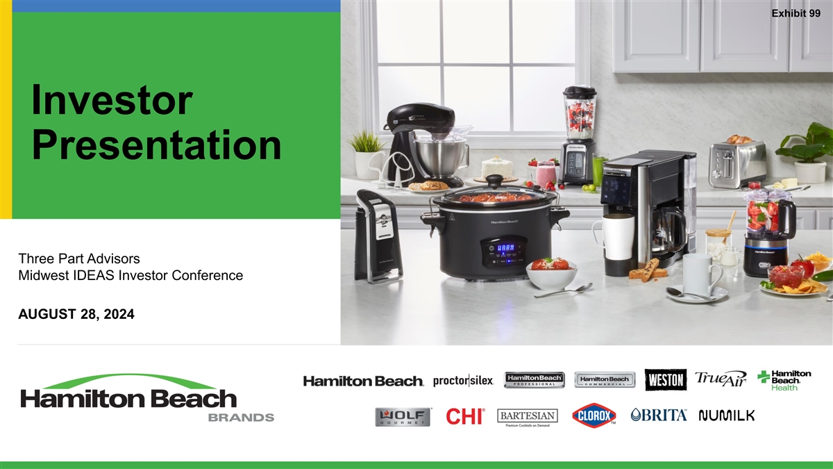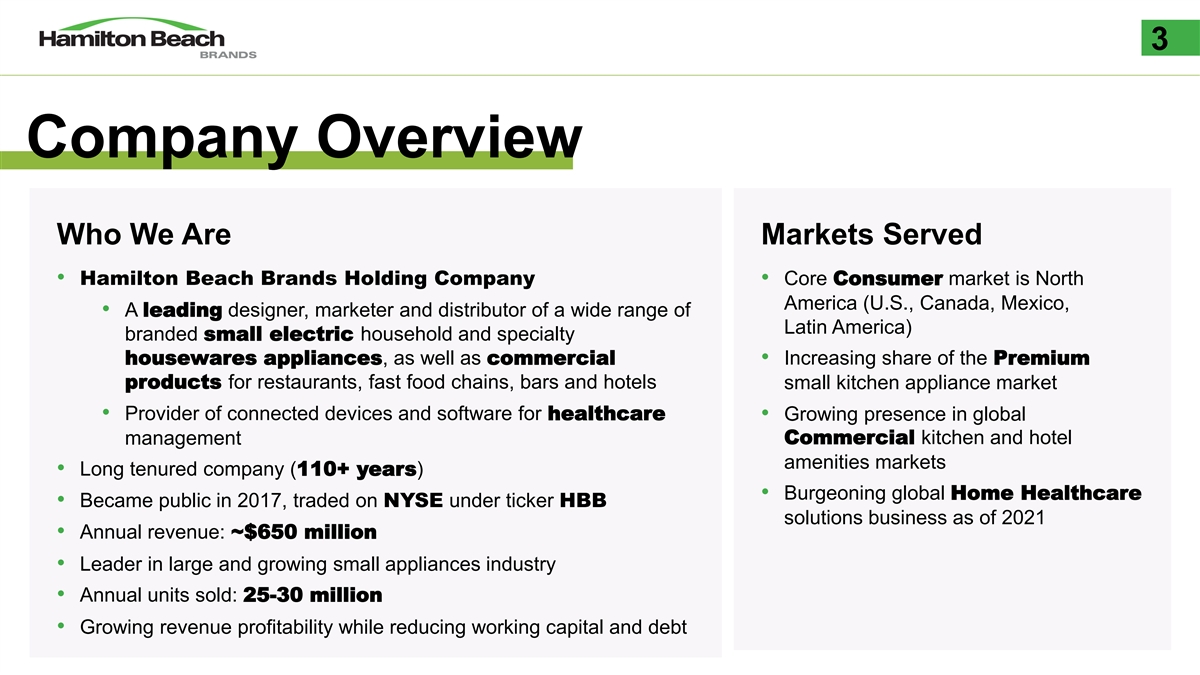 2 Forward-Looking Statements The statements contained in this presentation that are not historical facts are “forward-looking statements” within the meaning of Section 27A of the Securities Act of 1933 and Section 21E of the Exchange Act. These forward-looking statements are made subject to certain risks and uncertainties, which could cause actual results to differ materially from those presented. Readers are cautioned not to place undue reliance on these forward-looking statements, which speak only as of the date hereof. The Company undertakes no obligation to publicly revise these forward-looking statements to reflect events or circumstances that arise after the date hereof. Such risks and uncertainties include, without limitation: (1) uncertain or unfavorable global economic conditions and impacts from global military conflicts; (2) the Company’s ability to source and ship products to meet anticipated demand; (3) the Company’s ability to successfully manage constraints throughout the global transportation supply chain; (4) changes in the sales prices, product mix or levels of consumer purchases of small electric and specialty housewares appliances; (5) changes in consumer retail and credit markets, including the increasing volume of transactions made through third-party internet sellers; (6) bankruptcy of or loss of major retail customers or suppliers; (7) changes in costs, including transportation costs, of sourced products; (8) delays in delivery of sourced products; (9) changes in or unavailability of quality or cost effective suppliers; (10) exchange rate fluctuations, changes in the import tariffs and monetary policies and other changes in the regulatory climate in the countries in which the Company operates or buys and/or sells products; (11) the impact of tariffs on customer purchasing patterns; (12) product liability, regulatory actions or other litigation, warranty claims or returns of products; (13) customer acceptance of, changes in costs of or delays in the development of new products; (14) increased competition, including consolidation within the industry; (15) changes in customers’ inventory management strategies; (16) shifts in consumer shopping patterns, gasoline prices, weather conditions, the level of consumer confidence and disposable income as a result of economic conditions, unemployment rates or other events or conditions that may adversely affect the level of customer purchases of the Company’s products; (17) changes mandated by federal, state and other regulation, including tax, health, safety or environmental legislation; (18) the Company’s ability to identify, acquire or develop, and successfully integrate, new businesses or new product lines; and (19) other risk factors, including those described in the Company’s filings with the Securities and Exchange Commission, including, but not limited to, the Annual Report on Form 10-K for the year ended December 31, 2023. Furthermore, the future impact of unfavorable economic conditions, including inflation, changing interest rates, availability of capital markets and consumer spending rates remains uncertain. In uncertain economic environments, we cannot predict whether or when such circumstances may improve or worsen, or what impact, if any, such circumstances could have on our business, results of operations, cash flows and financial position.