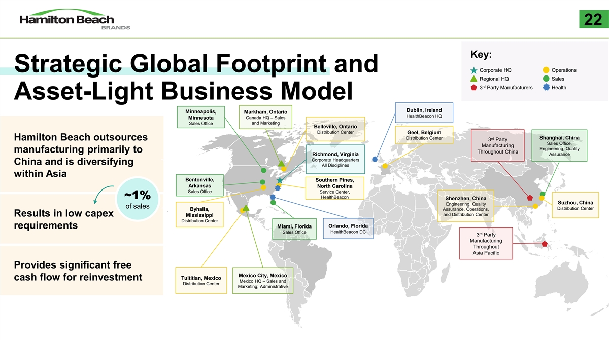 22 Key: Strategic Global Footprint and Corporate HQ Operations Regional HQ Sales rd 3 Party Manufacturers Health Asset-Light Business Model Dublin, Ireland Minneapolis, Markham, Ontario HealthBeacon HQ Canada HQ – Sales Minnesota Sales Office and Marketing Belleville, Ontario Distribution Center Geel, Belgium Shanghai, China Distribution Center rd Hamilton Beach outsources 3 Party Sales Office, Manufacturing Engineering, Quality manufacturing primarily to Throughout China Richmond, Virginia Assurance Corporate Headquarters China and is diversifying All Disciplines within Asia Bentonville, Southern Pines, Arkansas North Carolina Sales Office Service Center, ~1% HealthBeacon Shenzhen, China Suzhou, China Engineering, Quality of sales Distribution Center Byhalia, Assurance, Operations, and Distribution Center Results in low capex Mississippi Distribution Center Orlando, Florida requirements Miami, Florida Sales Office HealthBeacon DC rd 3 Party Manufacturing Throughout Asia Pacific Provides significant free Mexico City, Mexico Tultitlan, Mexico cash flow for reinvestment Mexico HQ – Sales and Distribution Center Marketing; Administrative