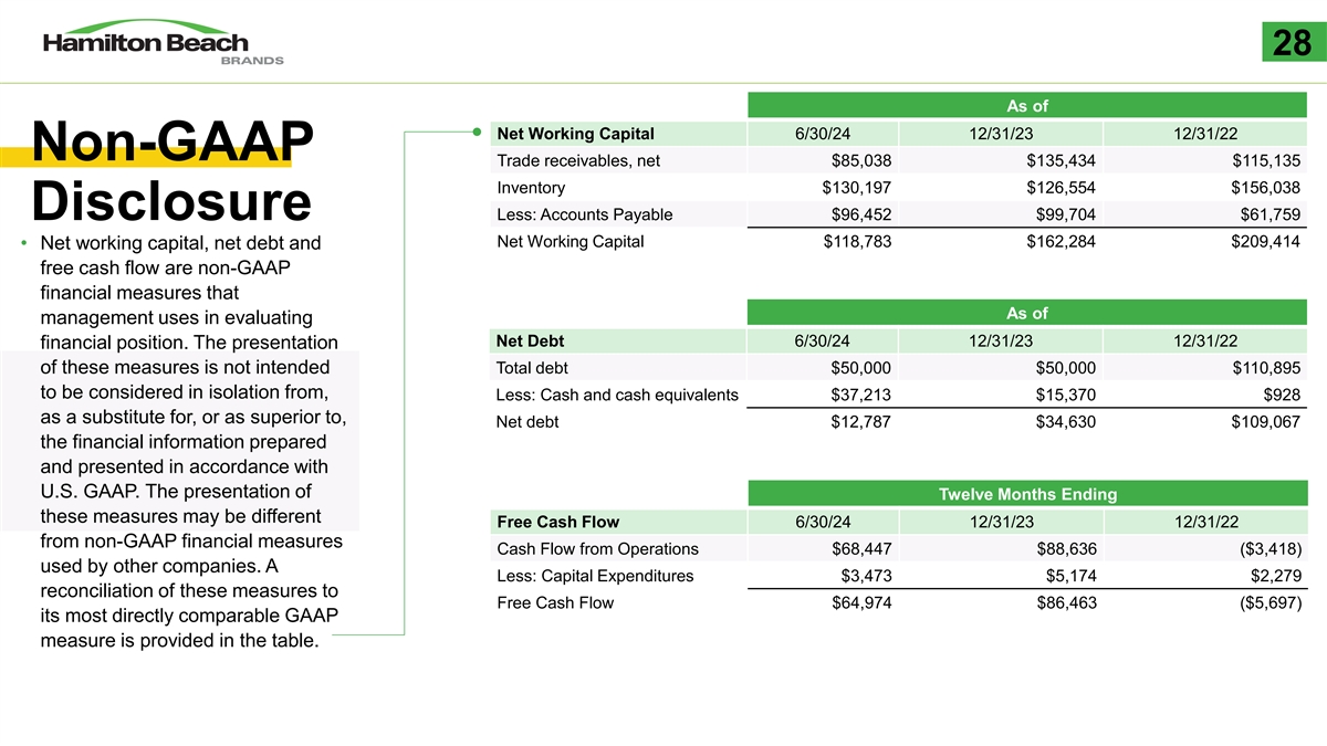 28 As of Net Working Capital 6/30/24 12/31/23 12/31/22 Non-GAAP Trade receivables, net $85,038 $135,434 $115,135 Inventory $130,197 $126,554 $156,038 Disclosure Less: Accounts Payable $96,452 $99,704 $61,759 Net Working Capital $118,783 $162,284 $209,414 • Net working capital, net debt and free cash flow are non-GAAP financial measures that As of management uses in evaluating Net Debt 6/30/24 12/31/23 12/31/22 financial position. The presentation of these measures is not intended Total debt $50,000 $50,000 $110,895 to be considered in isolation from, Less: Cash and cash equivalents $37,213 $15,370 $928 as a substitute for, or as superior to, Net debt $12,787 $34,630 $109,067 the financial information prepared and presented in accordance with U.S. GAAP. The presentation of Twelve Months Ending these measures may be different Free Cash Flow 6/30/24 12/31/23 12/31/22 from non-GAAP financial measures Cash Flow from Operations $68,447 $88,636 ($3,418) used by other companies. A Less: Capital Expenditures $3,473 $5,174 $2,279 reconciliation of these measures to Free Cash Flow $64,974 $86,463 ($5,697) its most directly comparable GAAP measure is provided in the table.