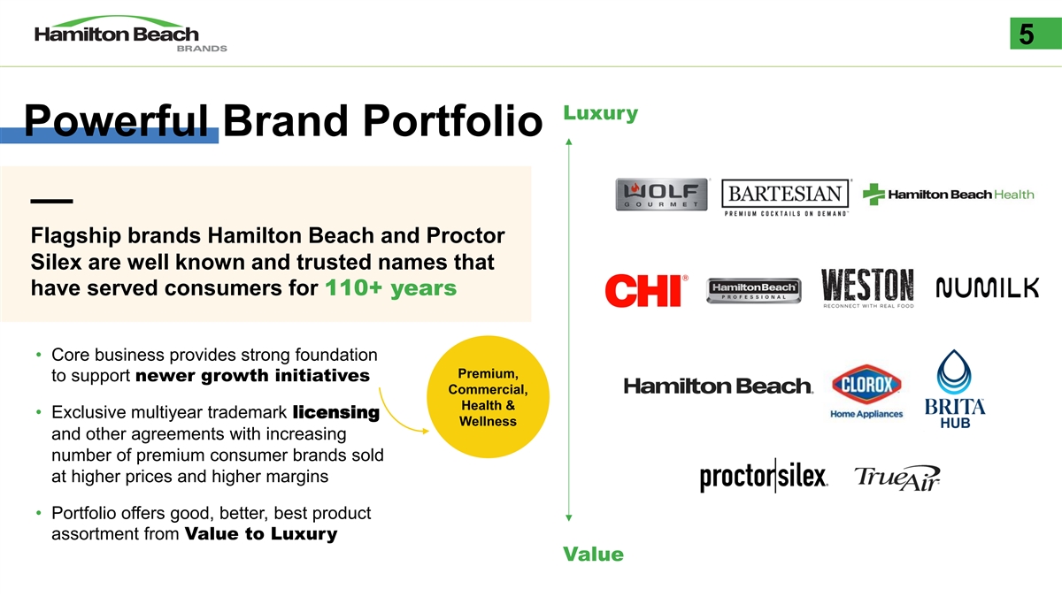 4 Investment Highlights 01 02 03 Leader in large and growing Proven innovator with 110+ Strong relationships consumer housewares market, years of industry leading R&D with key customers across all with a powerful portfolio of markets and channels, with a iconic brands leading ecommerce presence 04 05 06 07 Six strategic Asset-light business Disciplined capital Experienced initiatives to drive model generates allocation strategy of management team revenue growth and healthy free cash flow reinvestment in executing against margin expansion business, returning strategic priorities over time value to shareholders
