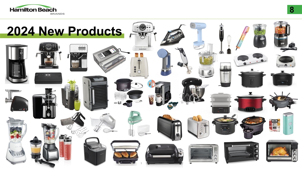 7 Consistent Product Innovation ® Hamilton Beach’s Good Thinking approach to consumer-driven innovation Goal is to • Gather data/feedback from 25,000+ maximize innovations consumer touchpoints annually with unique consumer • 200+ new product platforms benefits launched over last 5 years • Pipeline of innovative new products focused on core, premium, commercial, health & wellness markets • HBB grew dollar and unit market share in North America in 2023 and through first half of 2024¹ ¹ Source: Circana June 30, 2024
