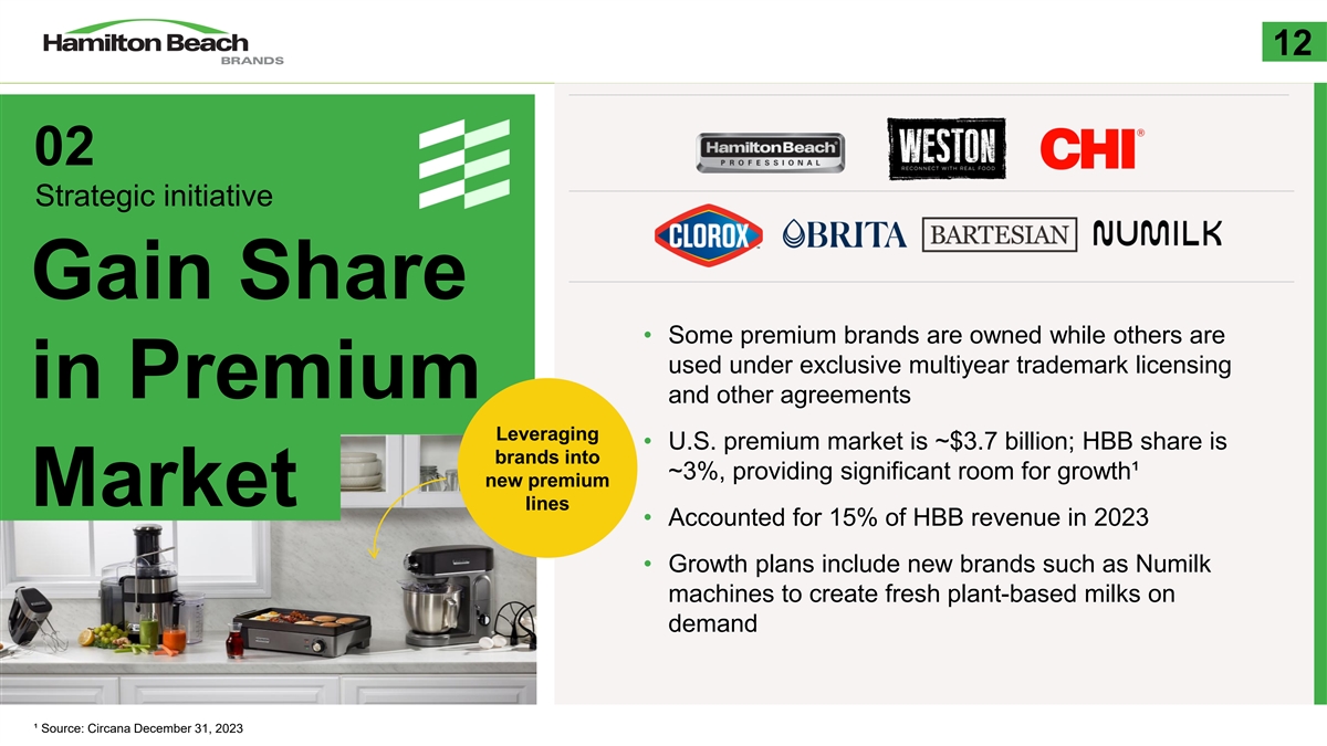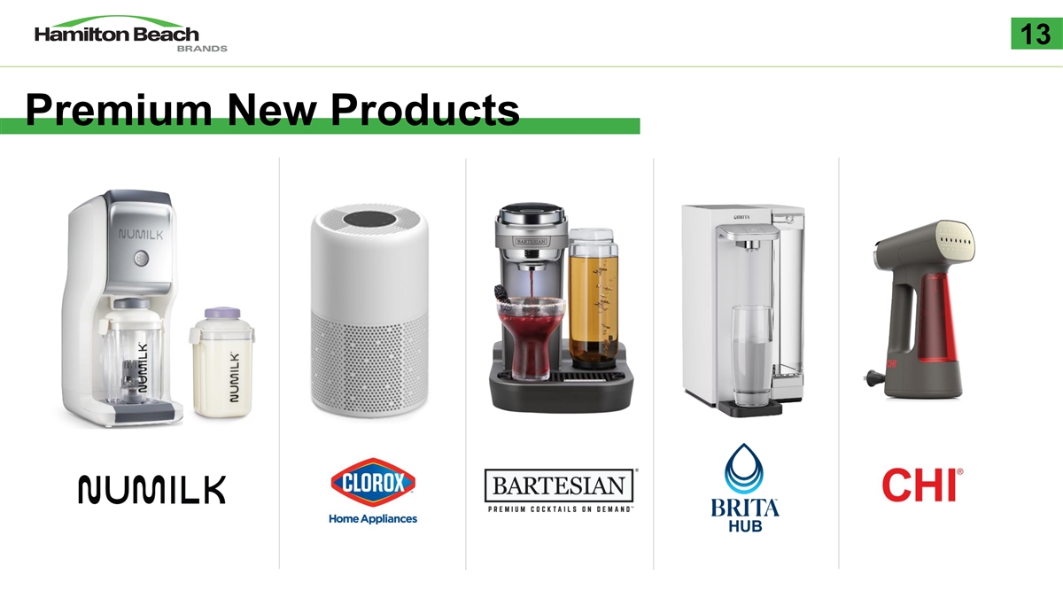 12 02 Strategic initiative Gain Share • Some premium brands are owned while others are used under exclusive multiyear trademark licensing in Premium and other agreements Leveraging • U.S. premium market is ~$3.7 billion; HBB share is brands into ~3%, providing significant room for growth¹ new premium Market lines • Accounted for 15% of HBB revenue in 2023 • Growth plans include new brands such as Numilk machines to create fresh plant-based milks on demand ¹ Source: Circana December 31, 2023
