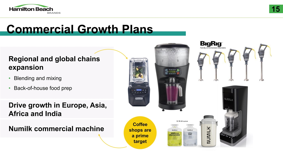 14 03 Strategic initiative • Increasing participation in multi-billion-dollar Lead in Global global market with significant upside • Investing in higher margin products for commercial food service/beverages and Commercial hotel amenities • Accounted for 8% of HBB revenue in 2023 Market • Growth plans include product innovation, increasing sales with existing and new customers, and leveraging HBB partnerships