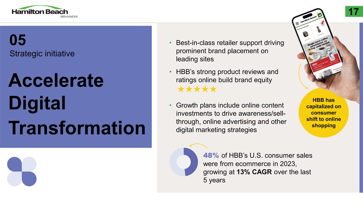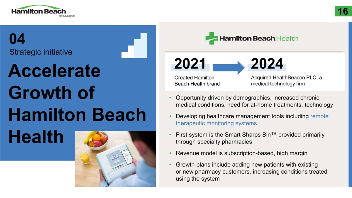 16 04 Strategic initiative 2021 2024 Accelerate Acquired HealthBeacon PLC, a Created Hamilton Beach Health brand medical technology firm Growth of • Opportunity driven by demographics, increased chronic medical conditions, need for at-home treatments, technology • Developing healthcare management tools including remote Hamilton Beach therapeutic monitoring systems • First system is the Smart Sharps Bin provided primarily Health through specialty pharmacies • Revenue model is subscription-based, high margin • Growth plans include adding new patients with existing or new pharmacy customers, increasing conditions treated using the system